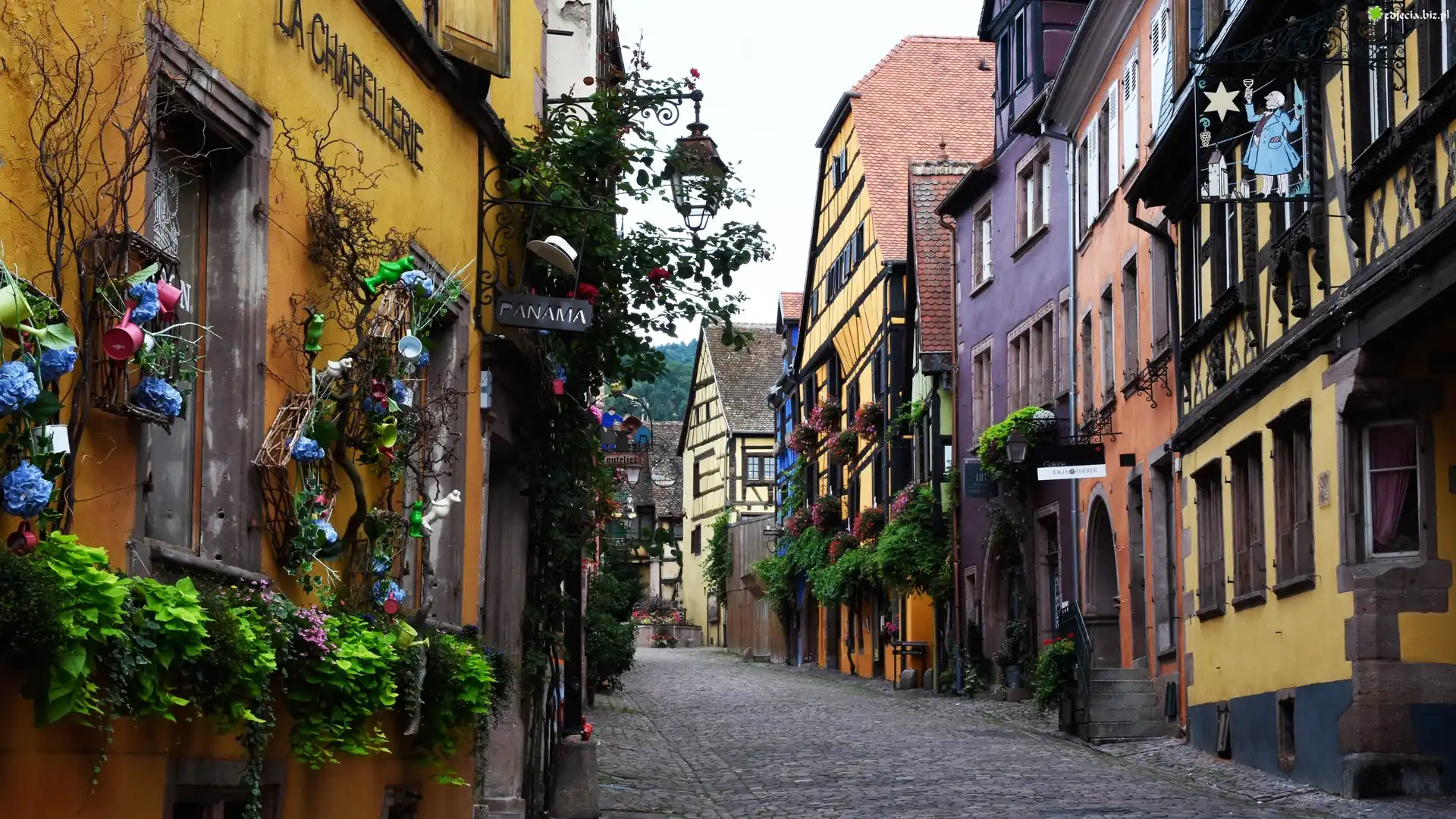 Zdjęcie Francja, Riquewihr, Kamienice, Uliczka, Kwiaty