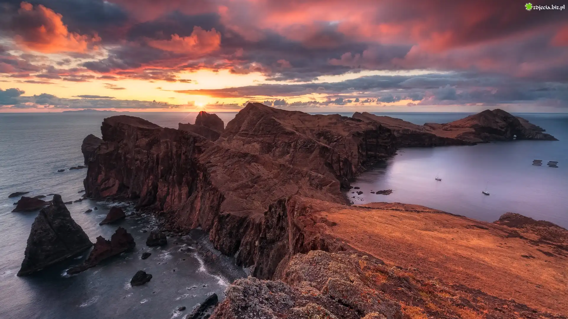 Zdjęcie Morze, Skały, Przylądek Pertusato, Zachód słońca, Chmury, Bonifacio, Korsyka, Francja