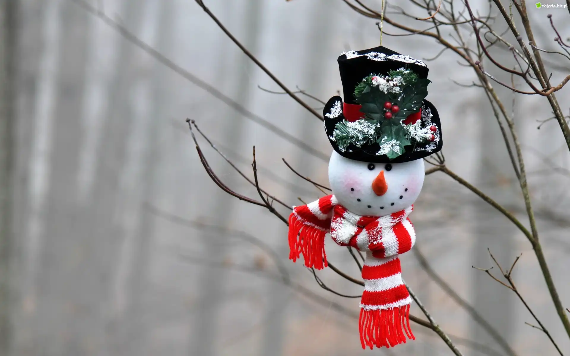 Zdjęcie Drzewo, Gałąź, Bałwanek, Szalik, Kapelusz, Las, Zima, Dekoracja