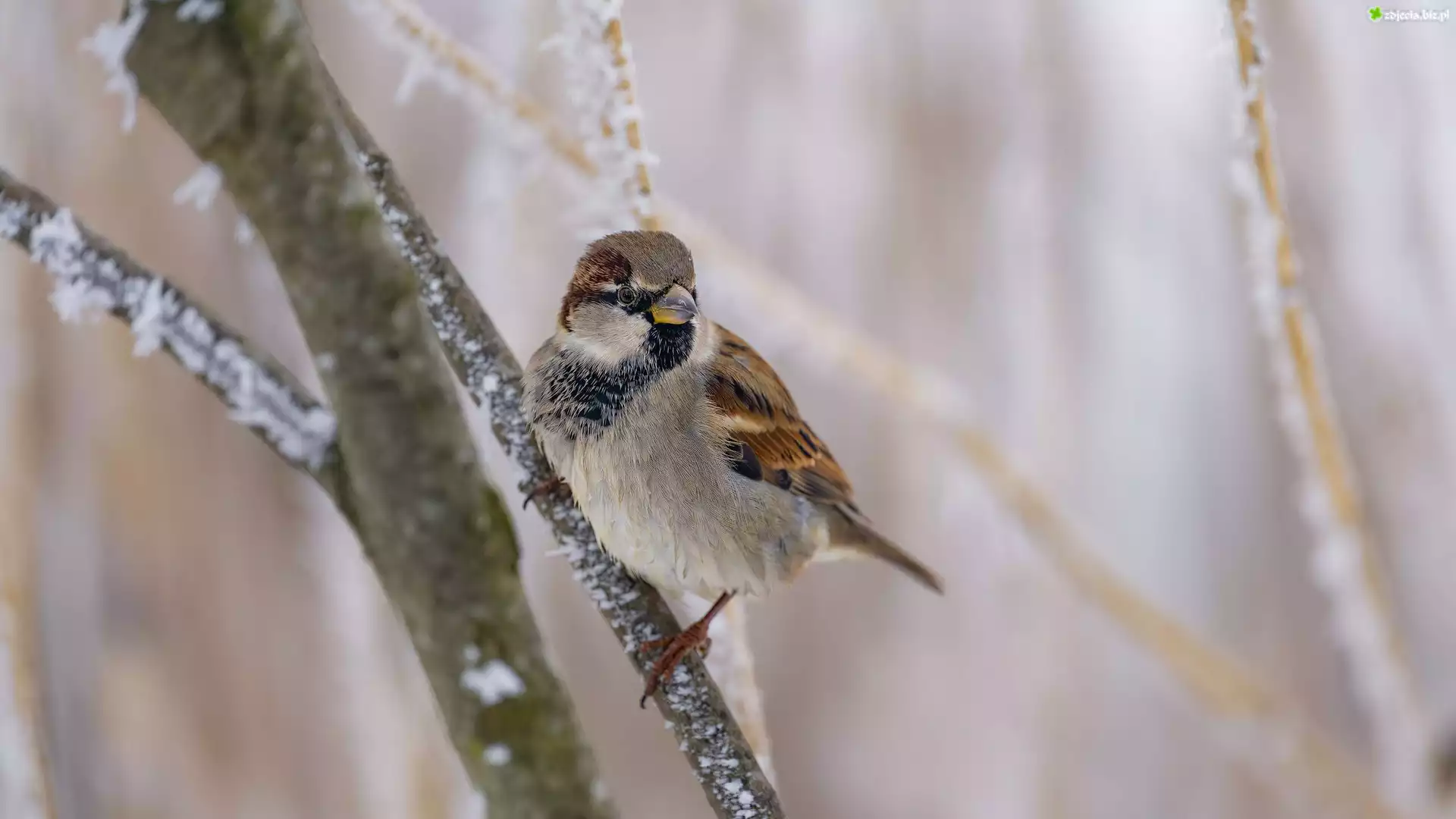 Zdjęcie, Ptak, Wróbel, Śnieg, Gałąź, Zima, Rozmycie