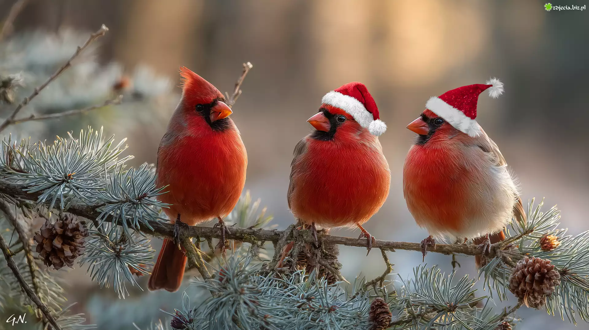 Zdjęcie Trzy, Ptaki, Kardynały, Gałązka, Sosna, Grafika AI
