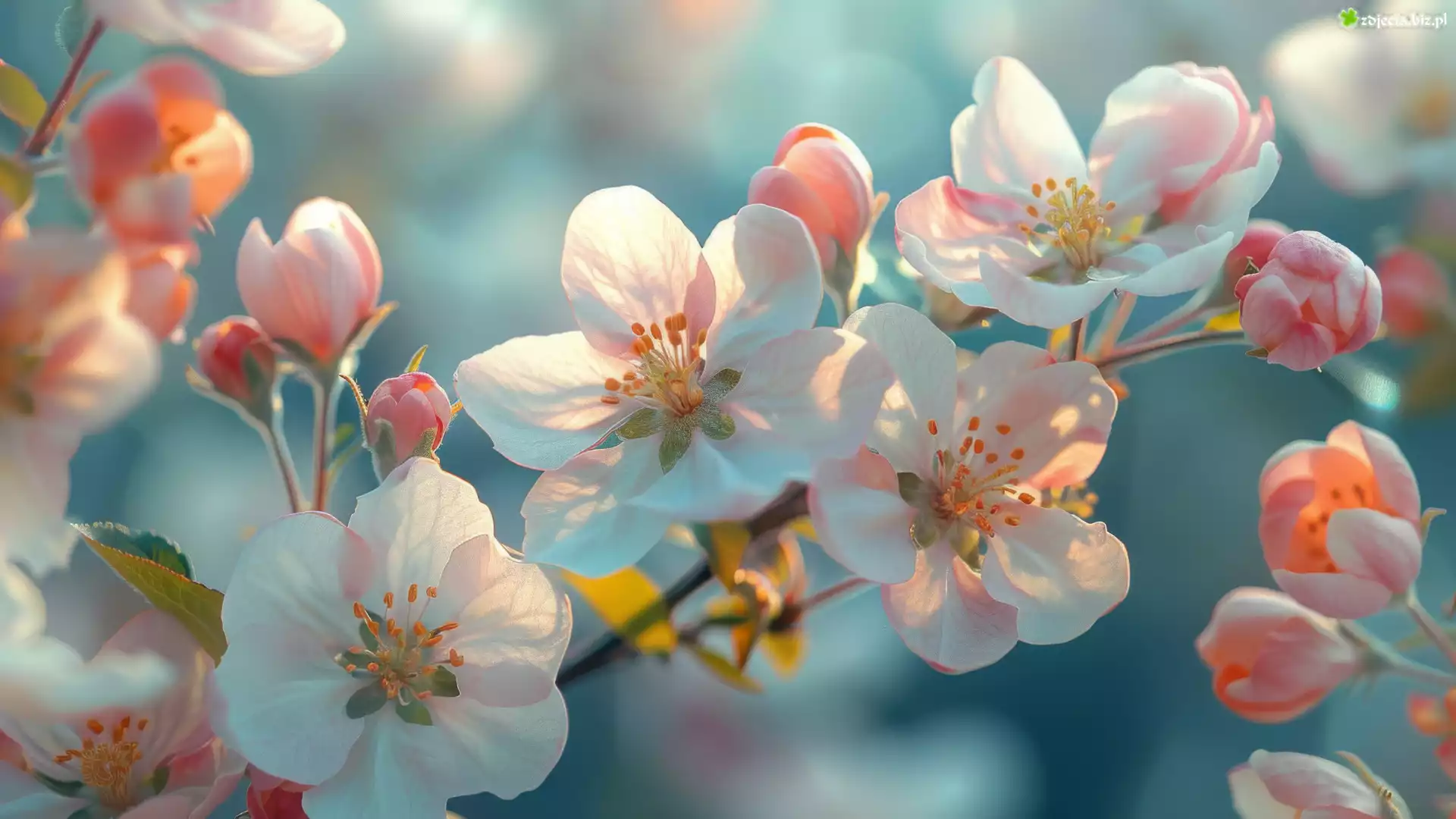 Zdjęcie Drzewo owocowe, Kwiaty, Biało-różowe, Pąki, Jabłoń, Gałązka