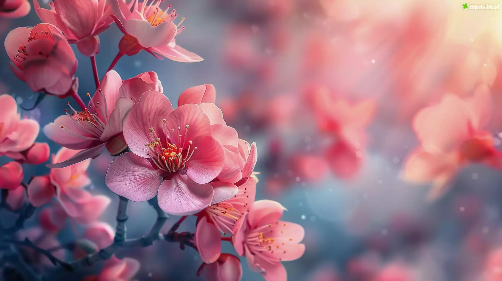 Zdjęcie Różowe, Rozkwitnięte, Kwiaty, Gałązka, Drzewo owocowe, Zbliżenie