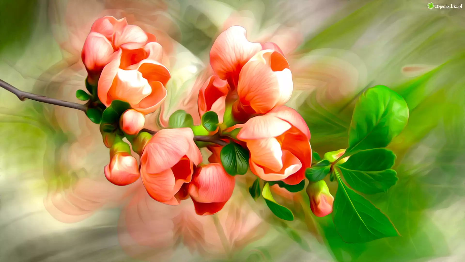 Zdjęcie Gałązka, Kwiaty, Listki, Pigwowiec, Grafika