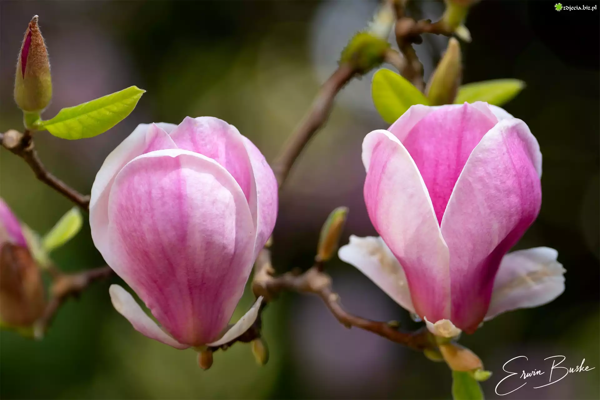 Zdjęcie Magnolia, Gałązka, Różowe, Kwiaty, Listki