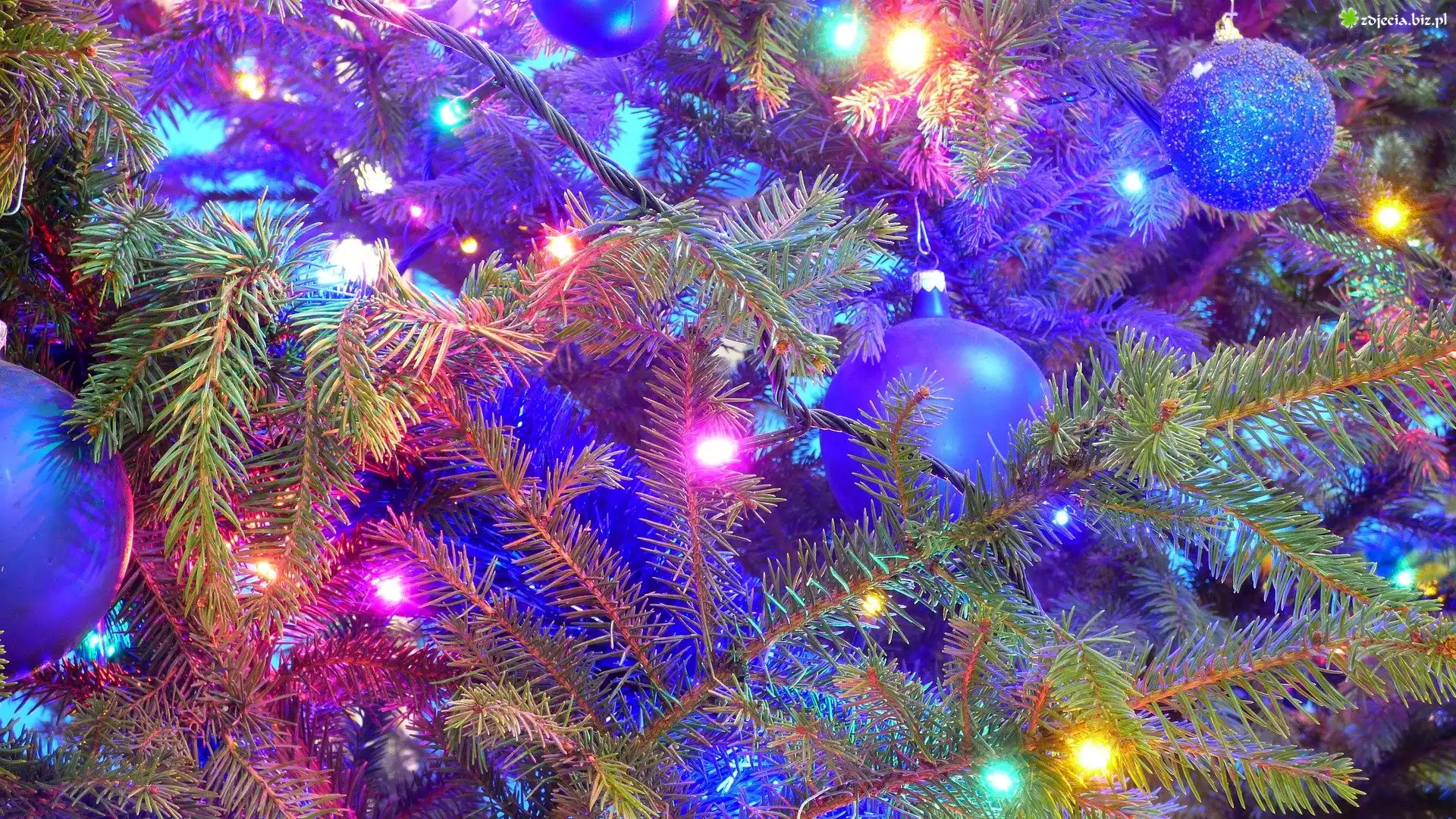 Zdjęcie Choinka, Gałązki, Świerk, Bombki, Lampki, Boże Narodzenie