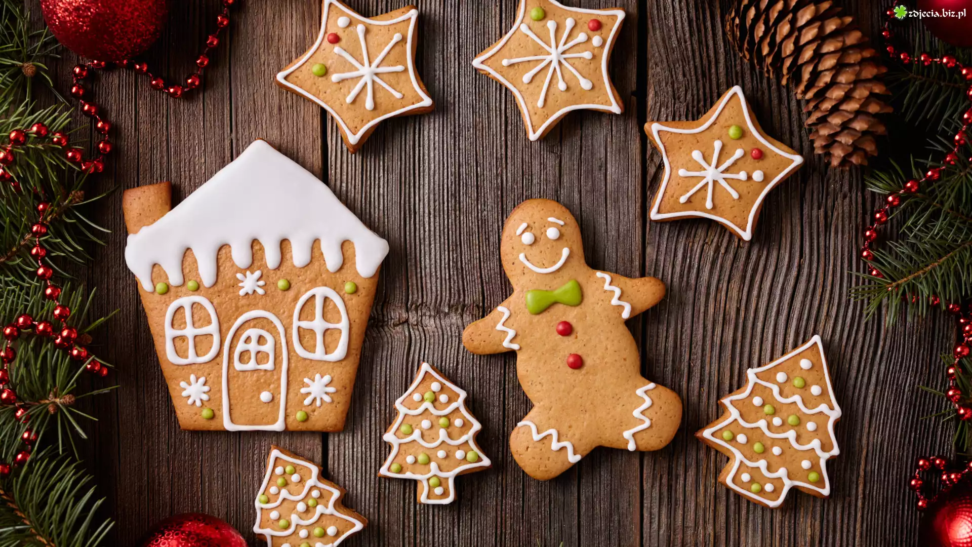 Zdjęcie Świąteczne, Ciasteczka, Pierniki, Gałązki, Koraliki, Deski