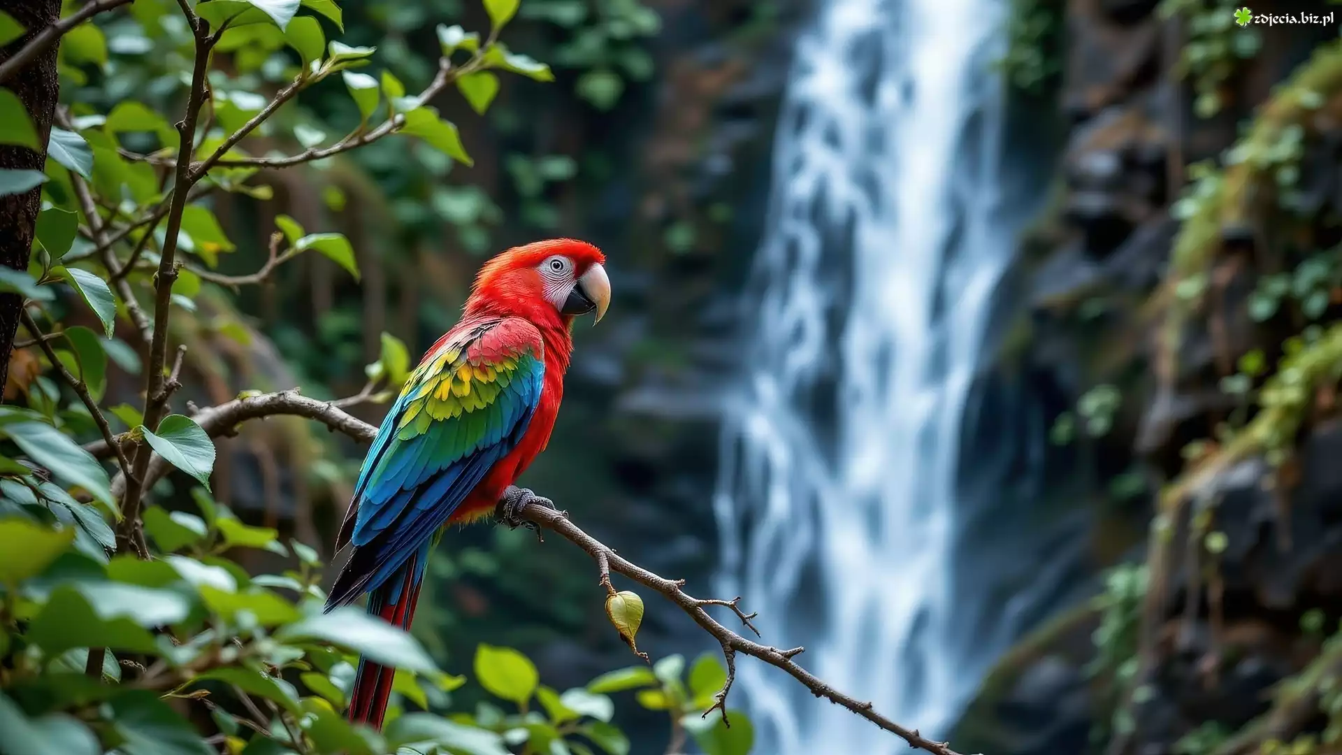 Zdjęcie Papuga, Ara, Drzewo, Gałązki, Wodospad, Grafika AI