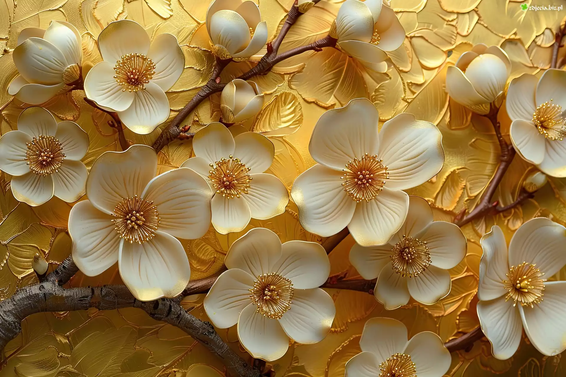 Zdjęcie Biało-złote, Kwiaty, Gałązki, Tło, Grafika