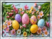 Zdjęcie, Wielkanoc, Pisanki, Jajka, Gałązki, Drobne, Kolorowe, Kwiaty