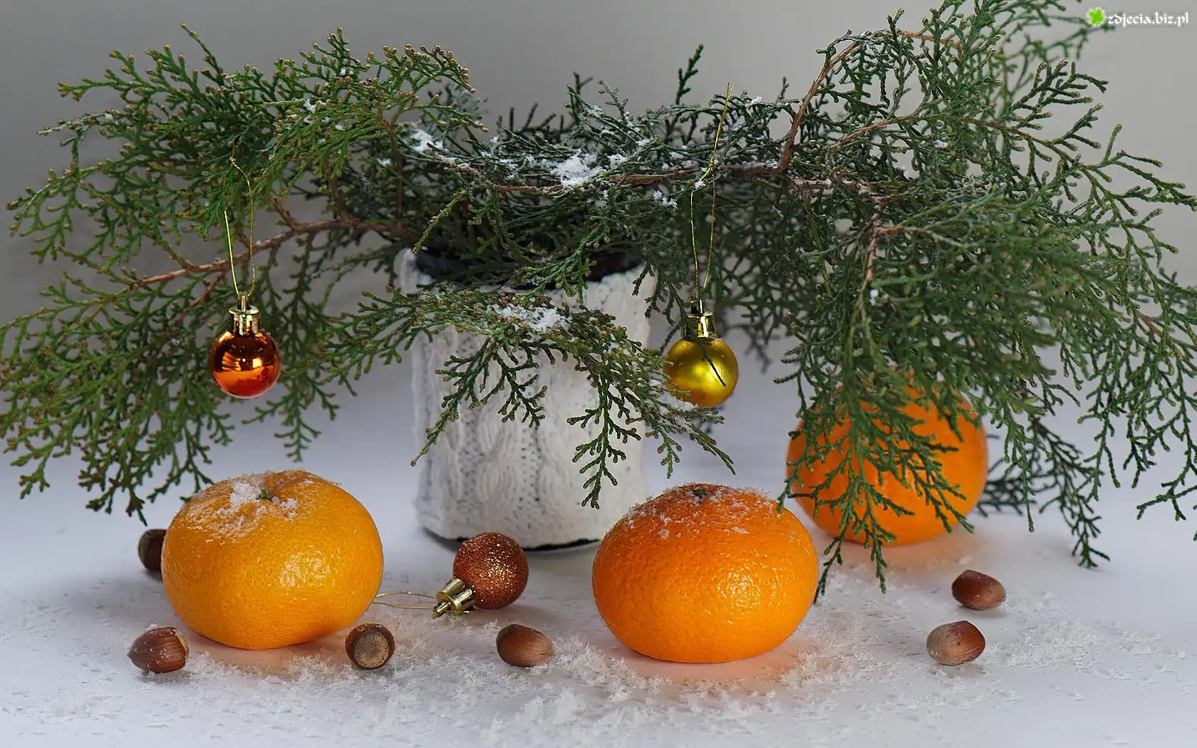 Zdjęcie Gałązki, Bombki, Mandarynki, Orzechy