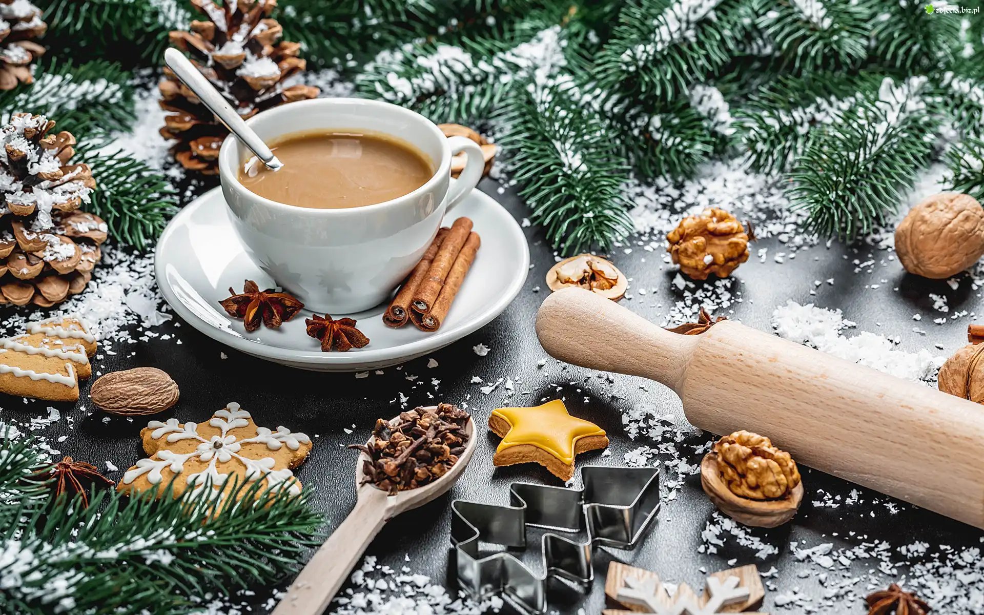 Zdjęcie Kompozycja, Świąteczna, Filiżanka, Kawa, Pierniczki, Orzechy, Cynamon, Anyż, Wałek, Gałązki |