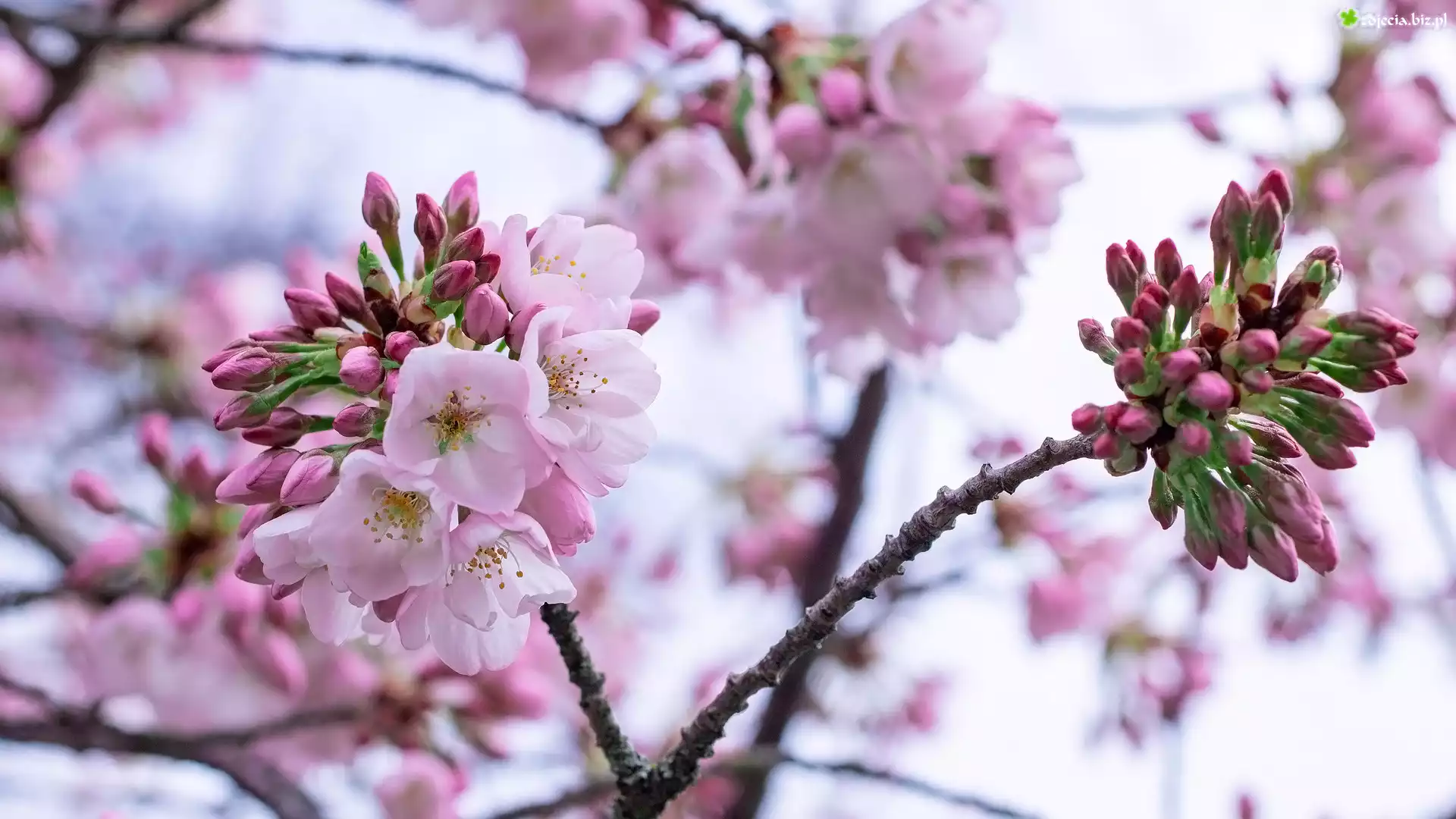 Zdjęcie Drzewo owocowe, Wiśnia, Gałązki, Kwiaty, Różowe