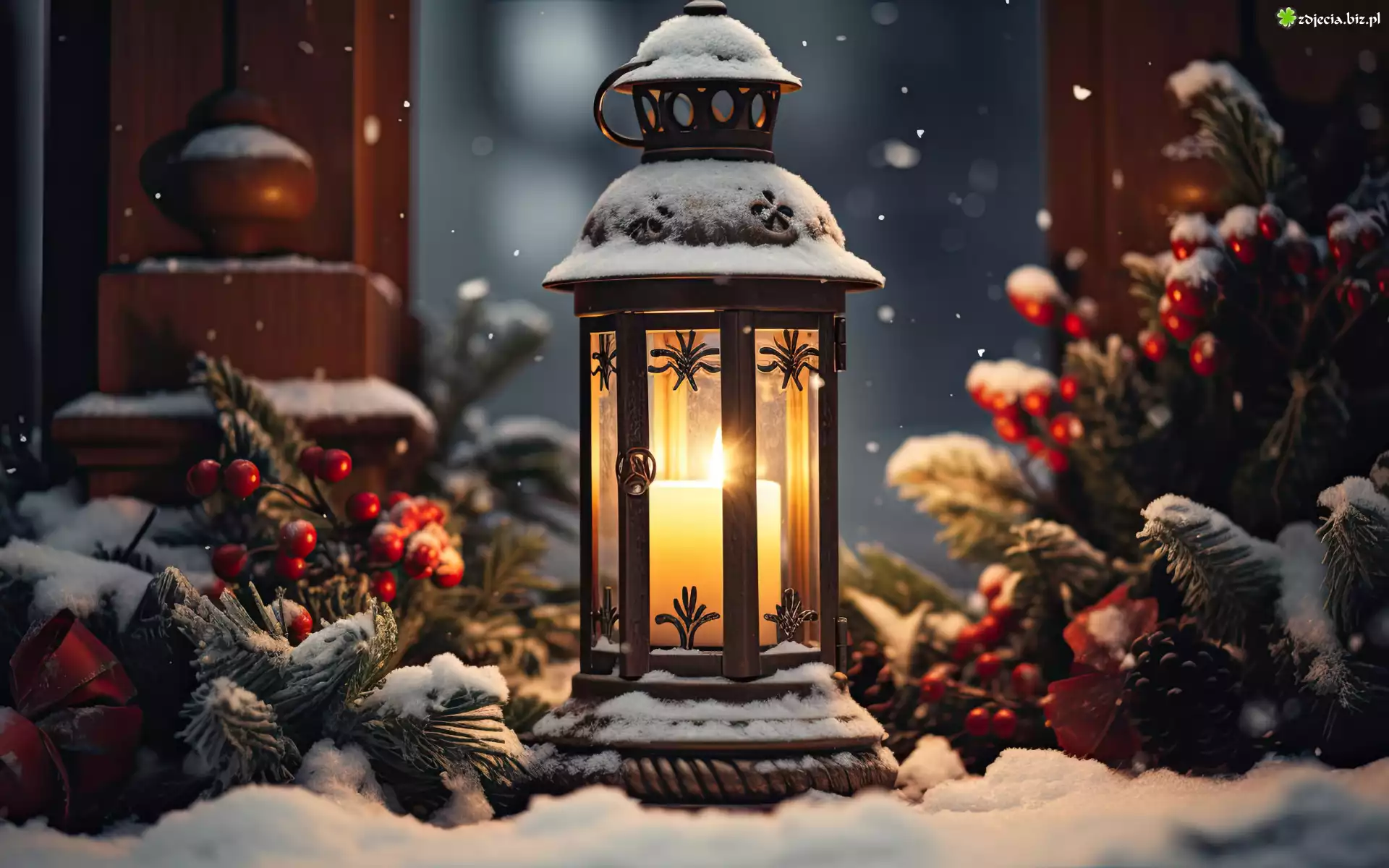 Zdjęcie Zima, Lampion, Śnieg, Gałązki, Ozdoby, Świeca