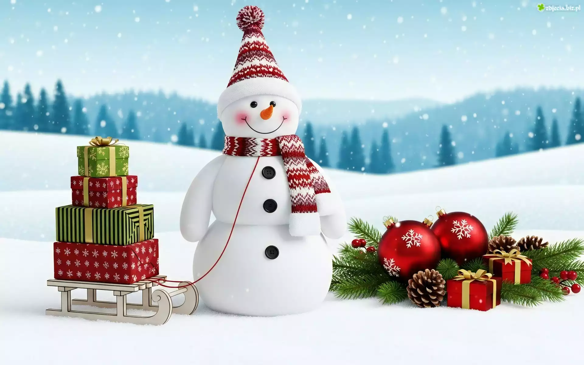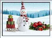 Zdjęcie Boże Narodzenie, Zima, Śnieg, Bałwan, Czapka, Szal, Sanki, Prezenty, Gałązki, Bombki, Szyszki |