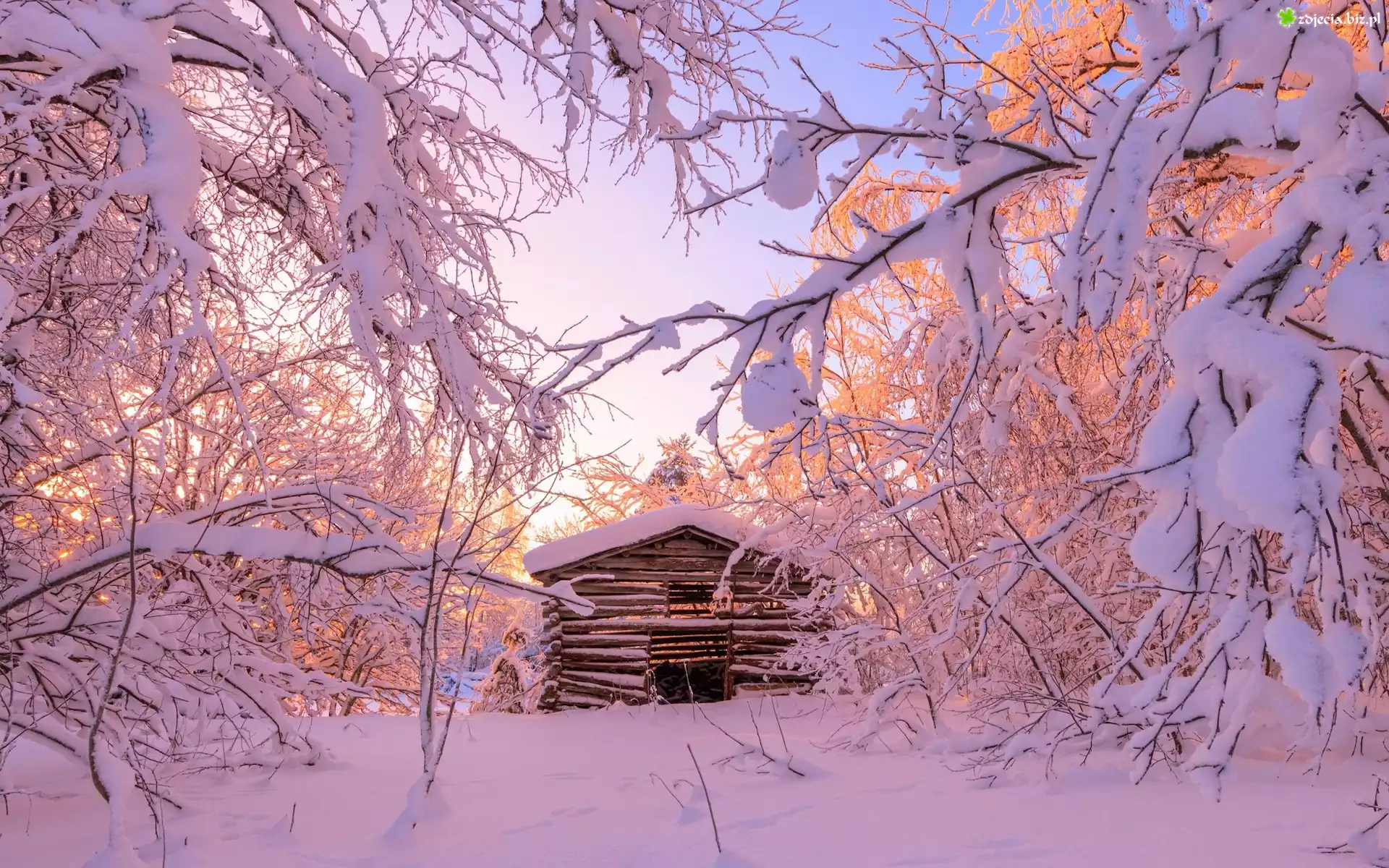 Zdjęcie Zima, Drzewa, Ośnieżone, Gałęzie, Szopa, Drewniana
