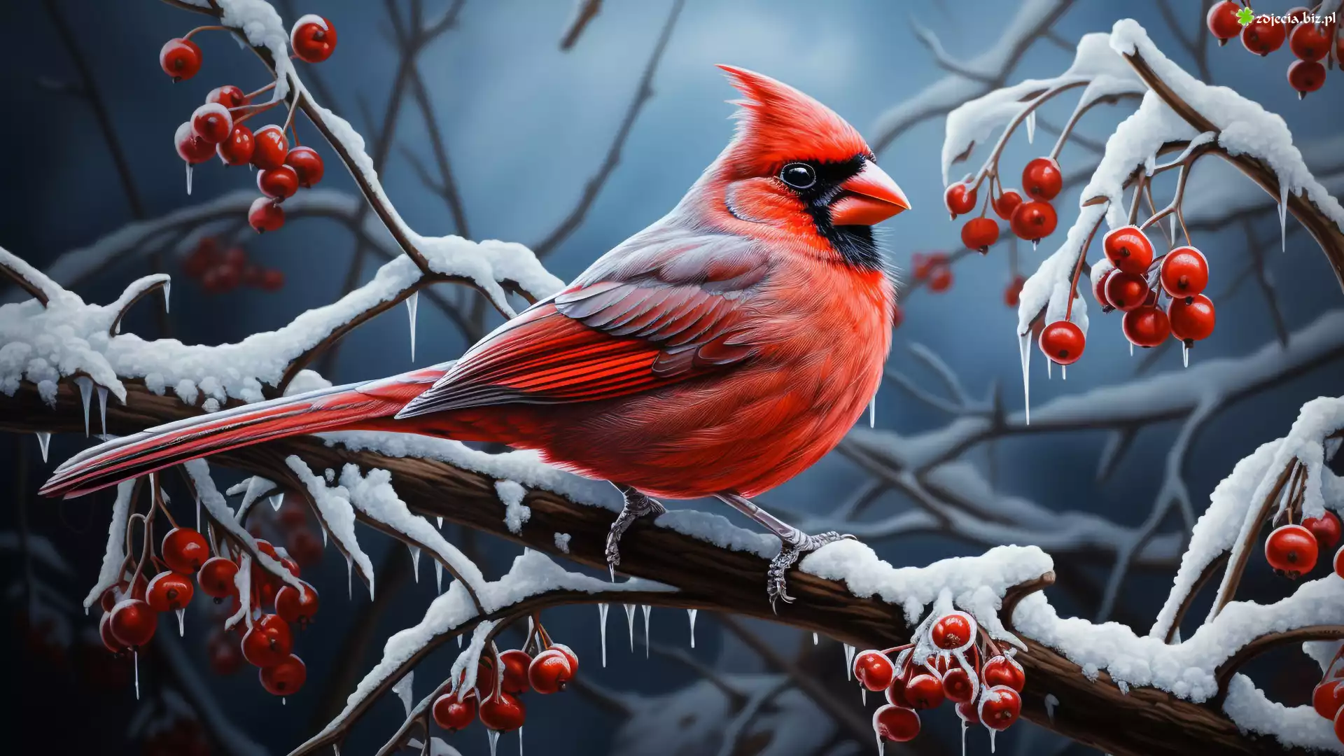 Zdjęcie, Ptak, Kardynał, Ośnieżone, Gałęzie, Czerwone, Owoce, 2D