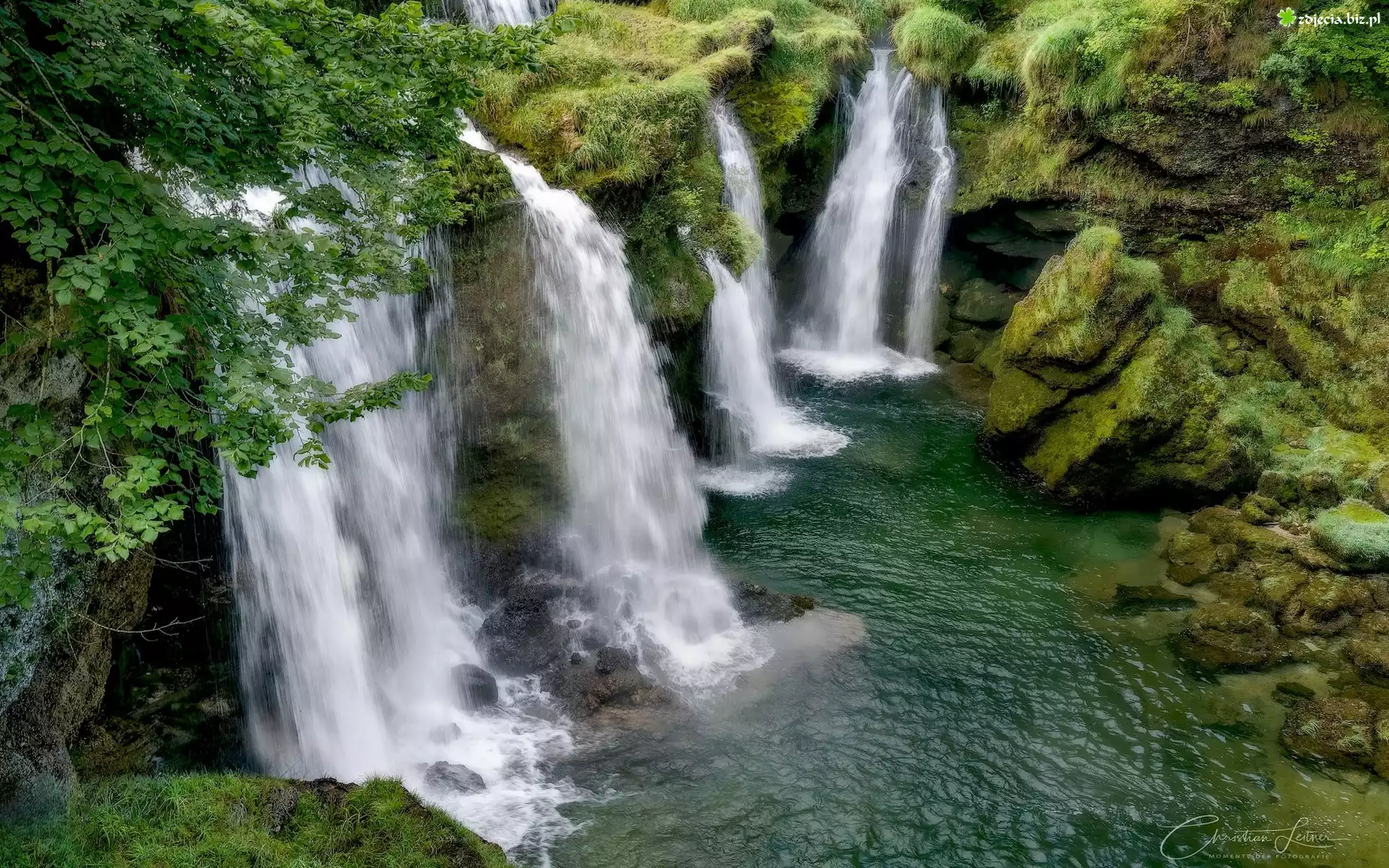 Zdjęcie Wodospad, Skały, Omszałe, Gałęzie