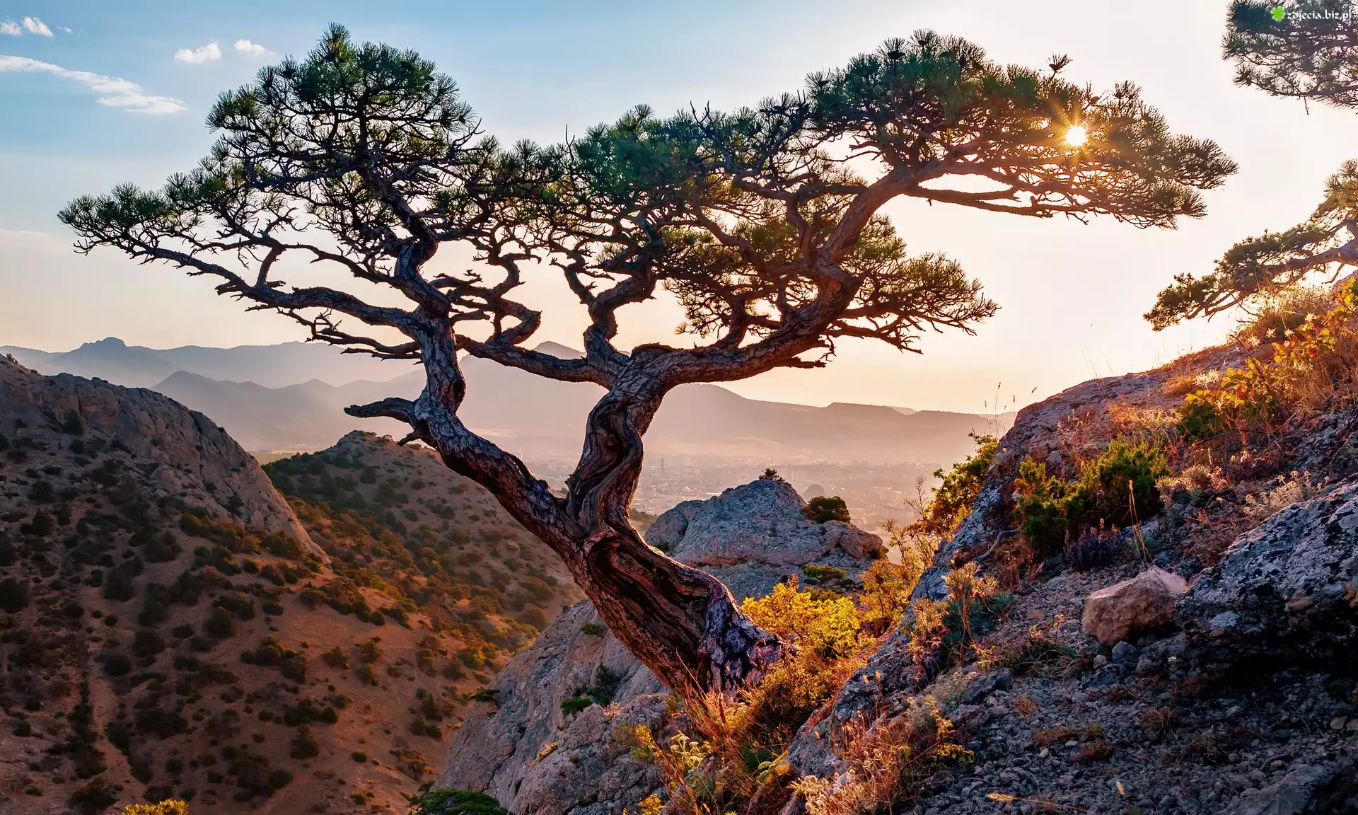 Zdjęcie Góry Krymskie, Góra Ai-Georgy, Skały, Drzewo, Wschód słońca, Sosna, Kolorowe, Rośliny, Sudak, Krym |