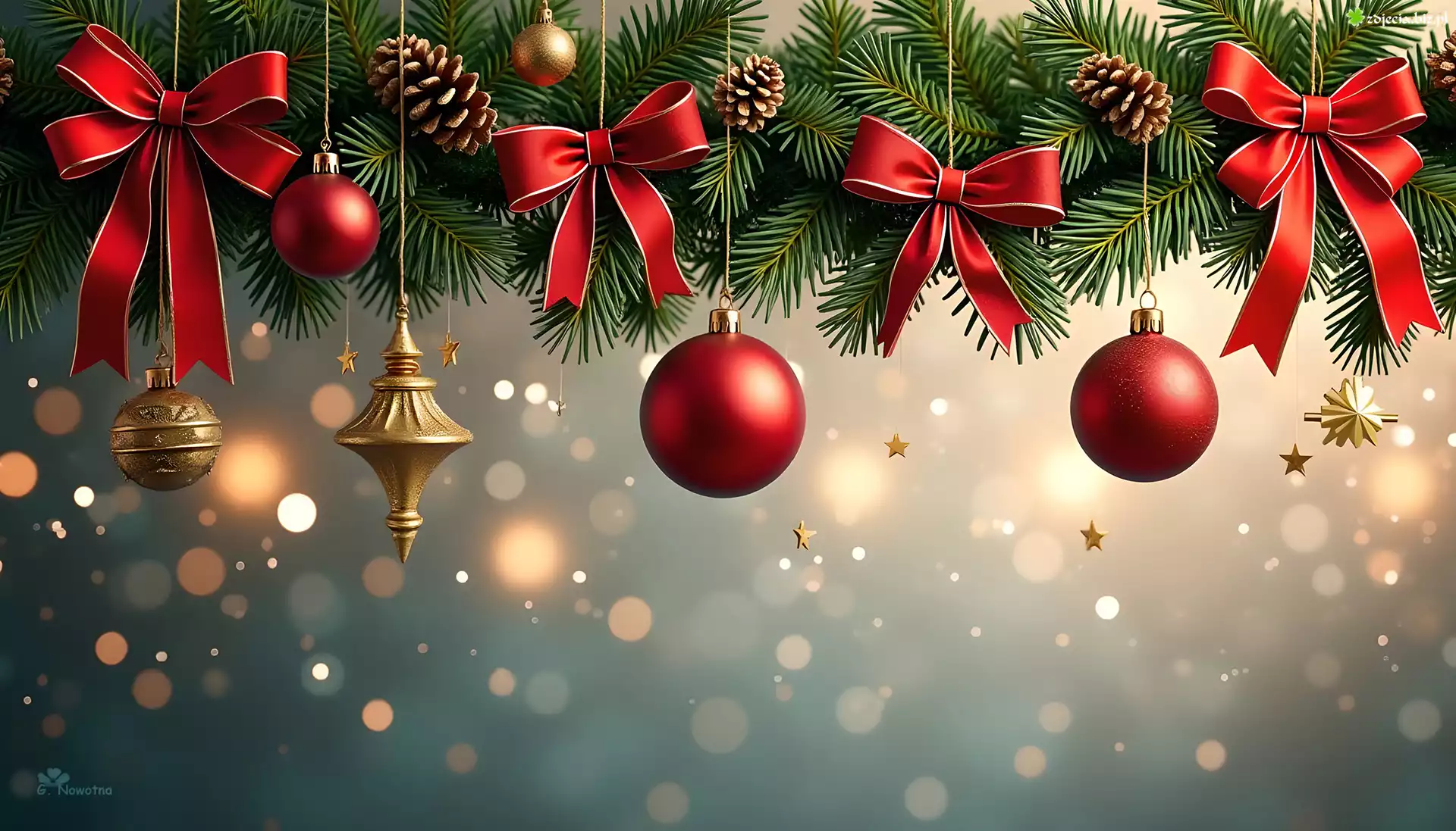 Zdjęcie, Girlanda, Ozdoby, Bombki, Kokardy, Szyszki, Gałązki, Grafika, Boże Narodzenie