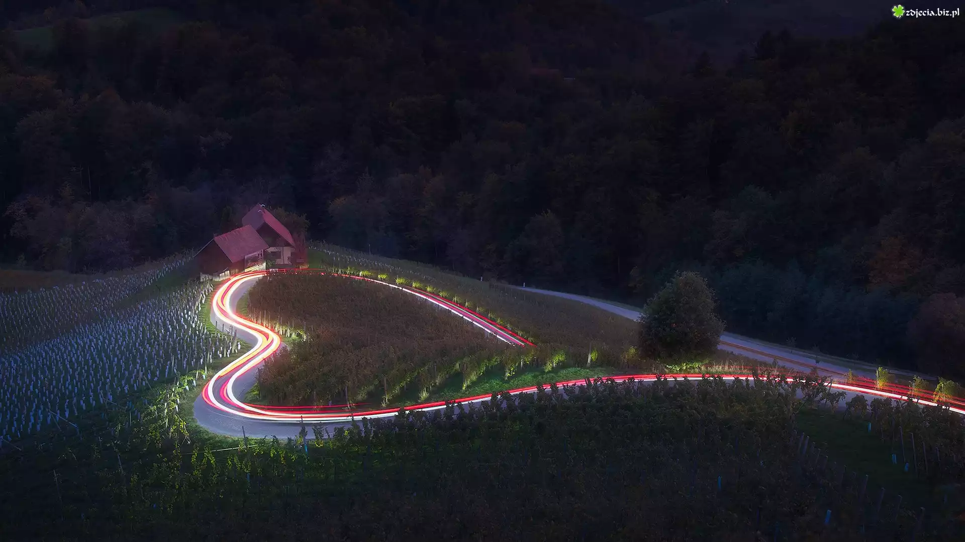 Zdjęcie Drzewa, Plantacja, Winnica, Oświetlona, Droga, Serce, Dom, Wieś Spicnik, Gmina Kungota, Słowenia |