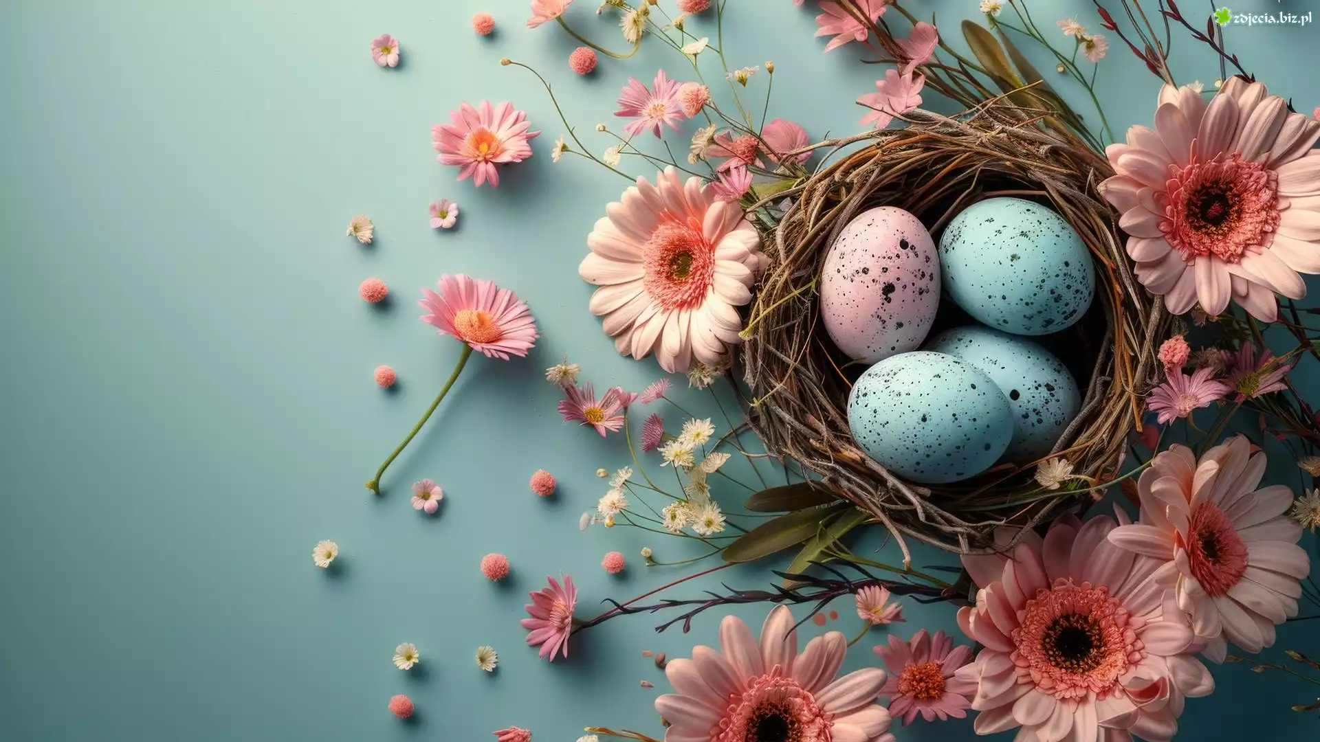 Zdjęcie Wielkanoc, Niebieskie, Różowe, Pisanki, Różowe, Kwiaty, Gerbery, Gniazdo
