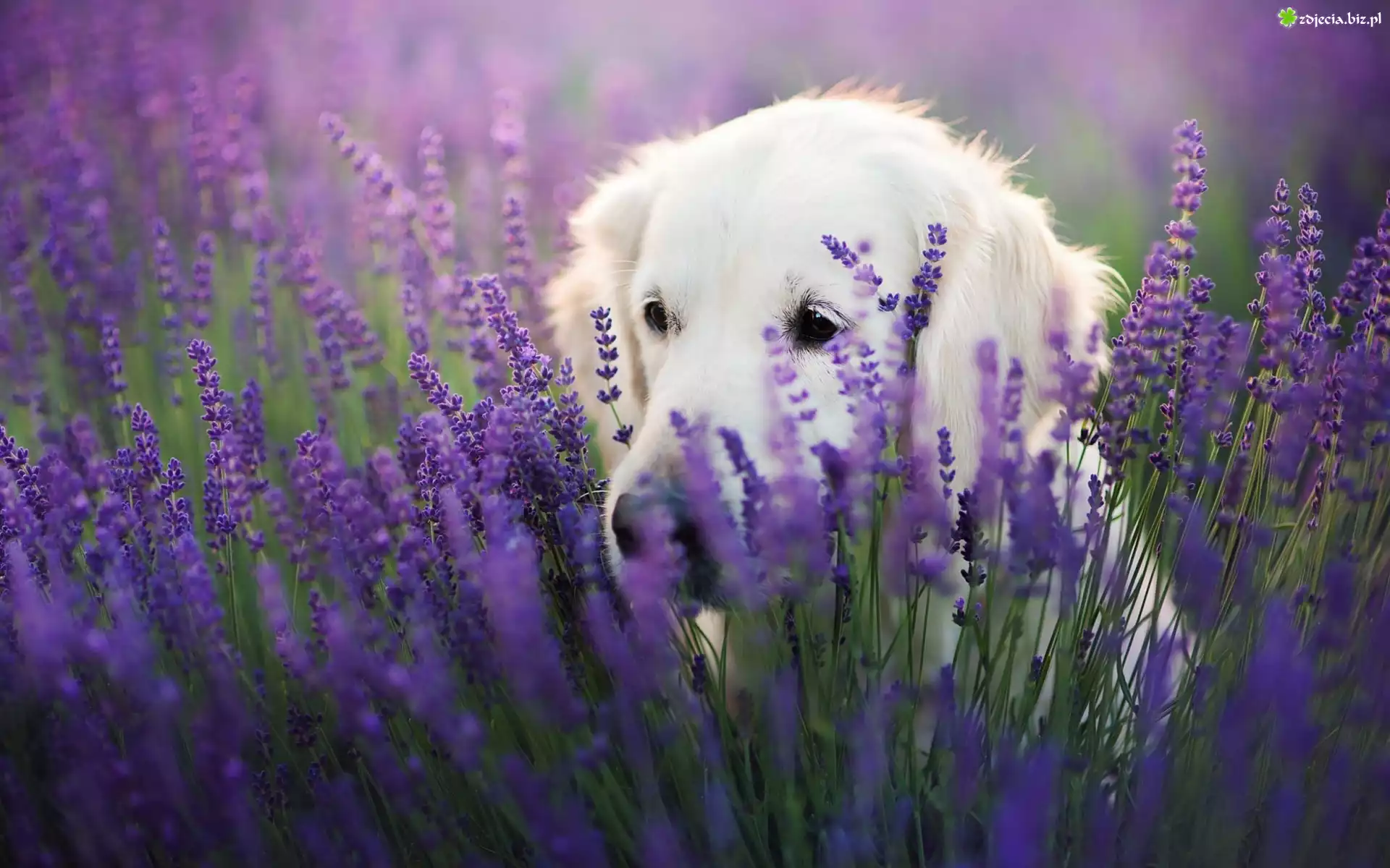 Zdjęcie, Golden retriever, Lawenda wąskolistna