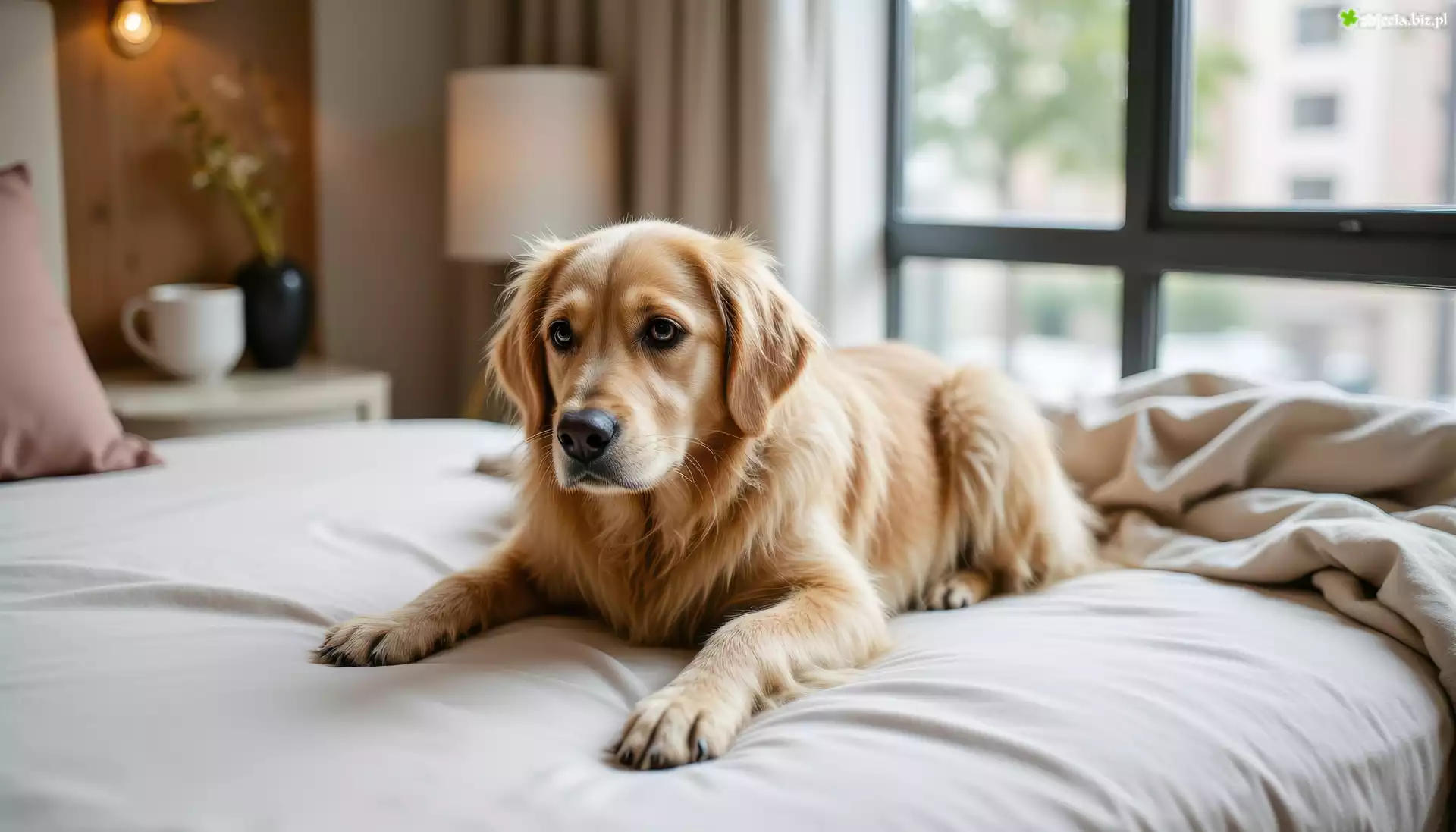 Zdjęcie, Pies, Golden retriever, Łóżko, Okno
