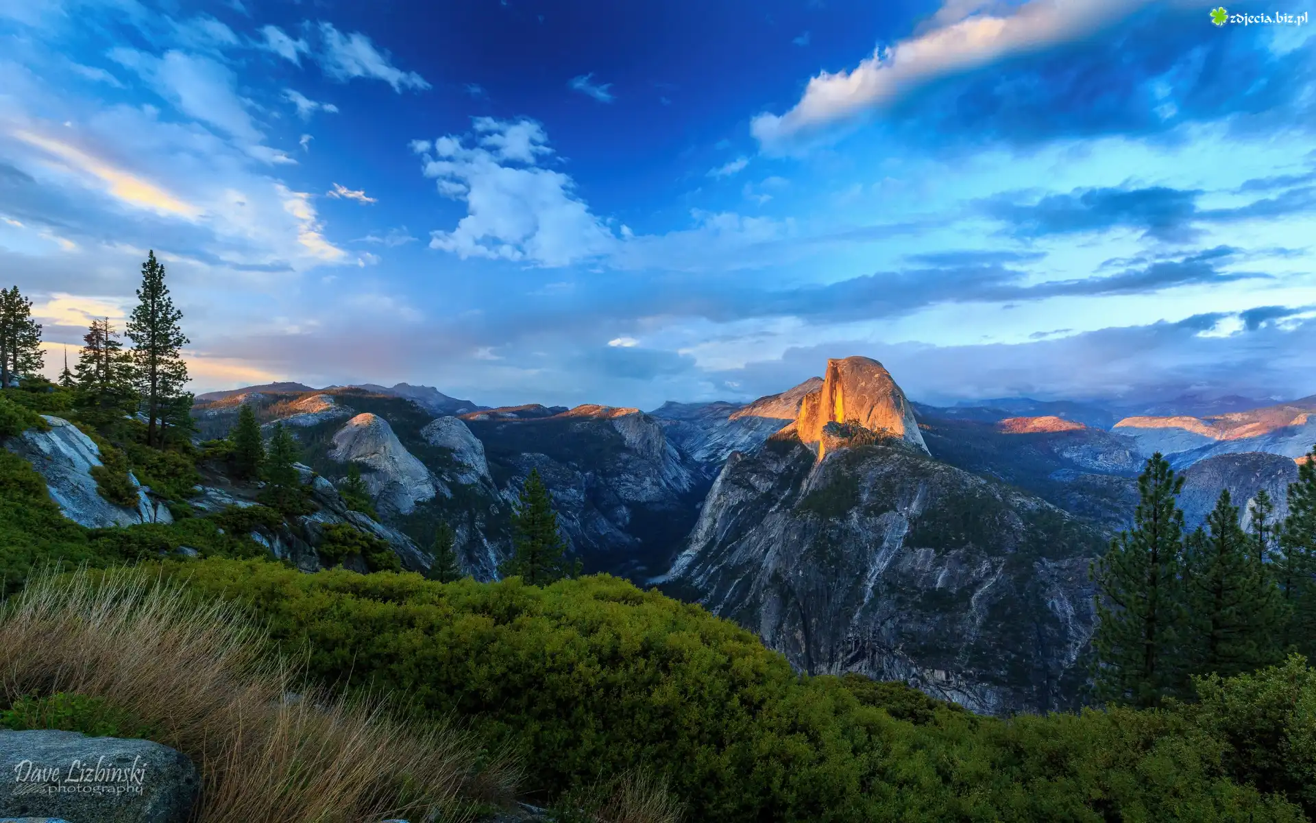 Zdjęcie, Góry, Rozświetlona, Góra, Half Dome, Park Narodowy Yosemite, Kalifornia, Stany Zjednoczone