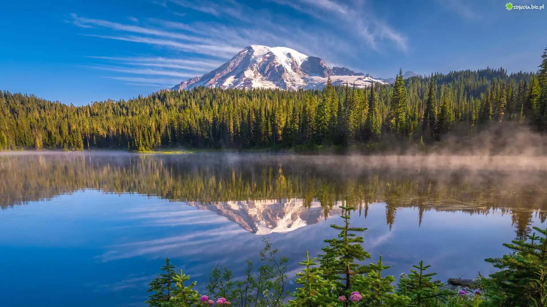 Zdjęcie Góra, Stratowulkan, Mount Rainier, Jezioro, Reflection Lakes, Park Narodowy Mount Rainier, Drzewa, Mgła, Stan Waszyngton, Stany Zjednoczone |