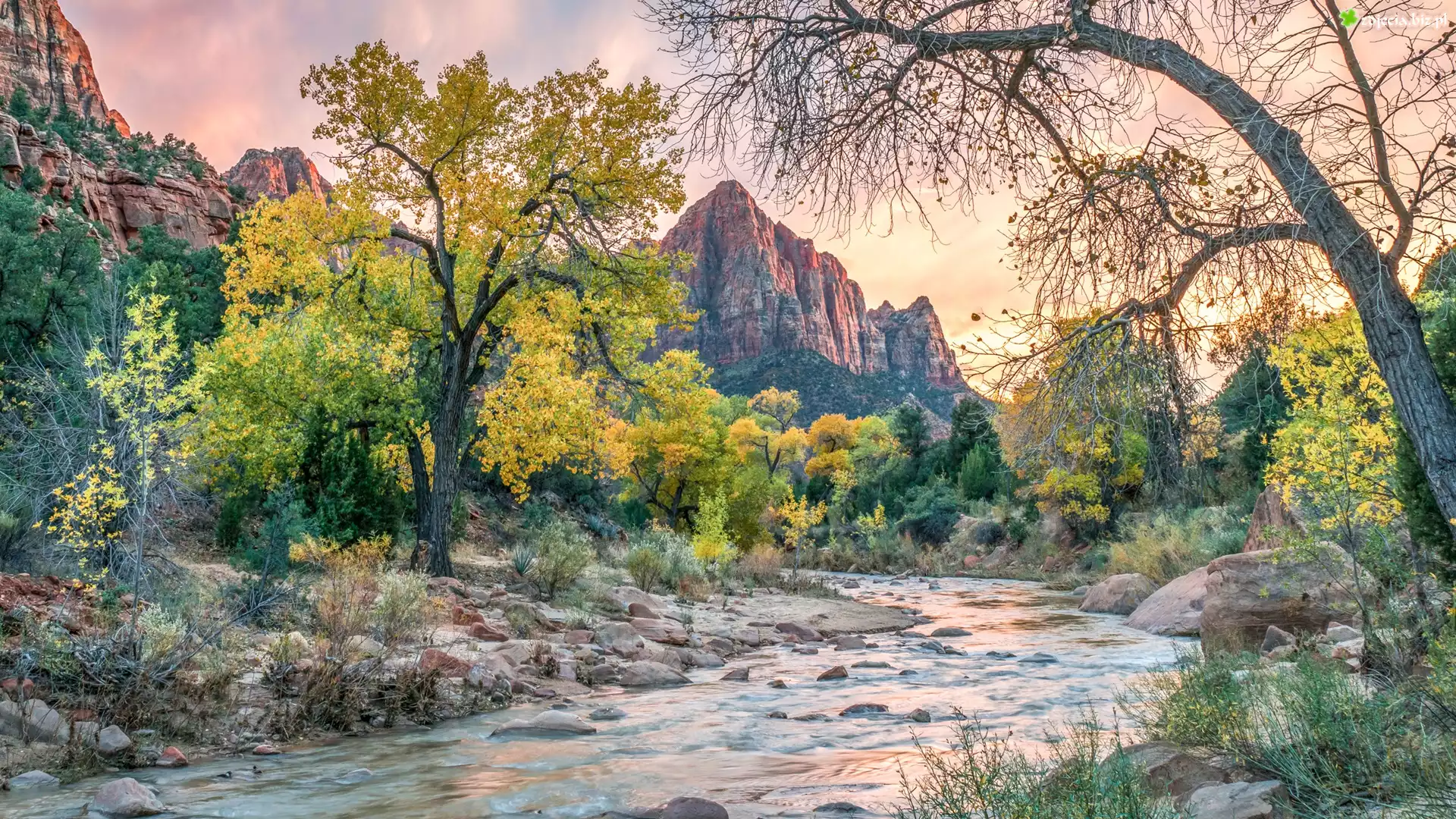 Zdjęcie Park Narodowy Zion, Góry, Góra Watchman, Drzewa, Rzeka, Virgin River, Stan Utah, Stany Zjednoczone |