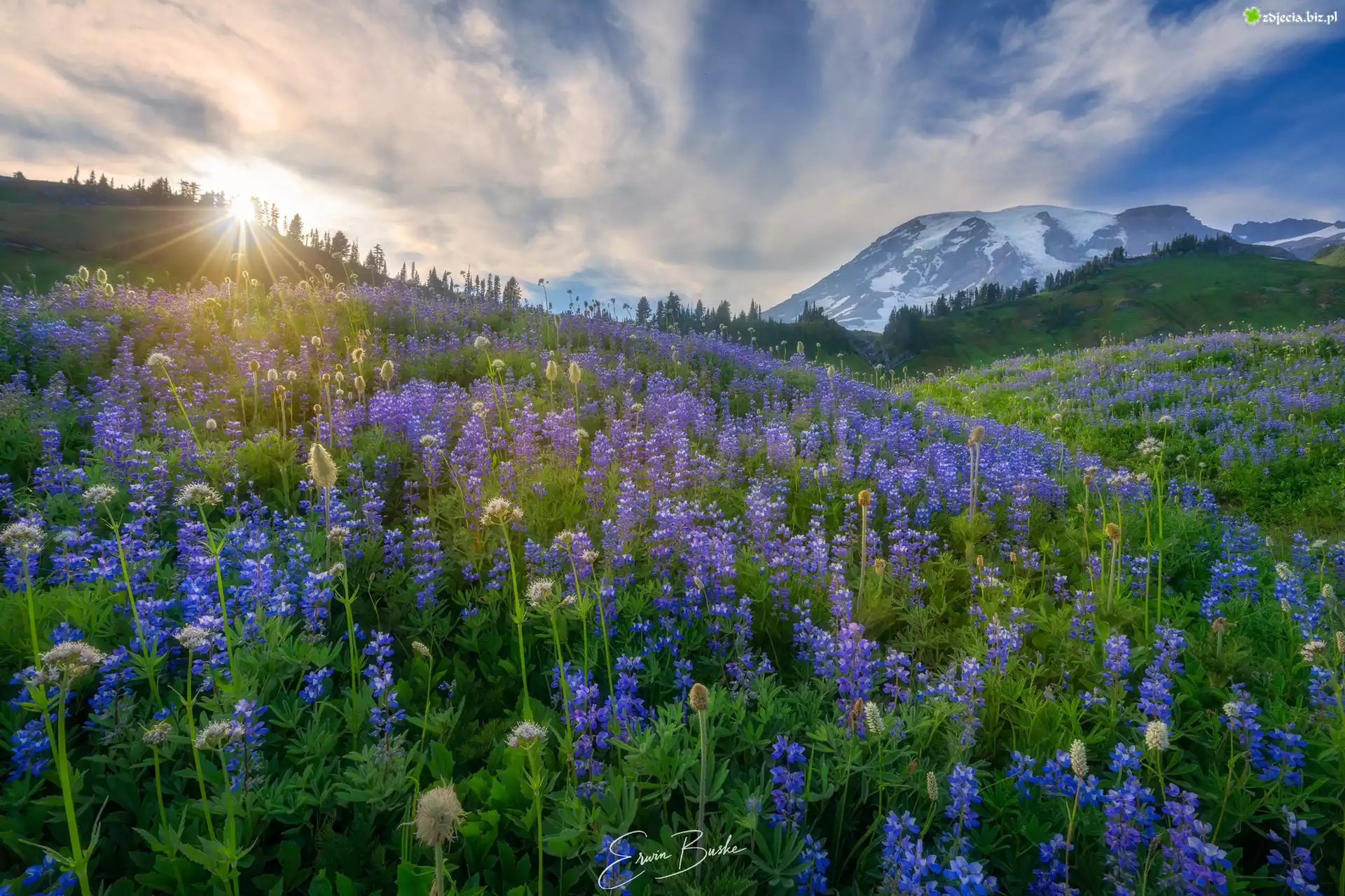 Zdjęcie Stany Zjednoczone, Waszyngton, Park Narodowy Mount Rainier, Góra, Mount Rainier, Wzgórza, Polana, Kwiaty, Łubin, Łąka |