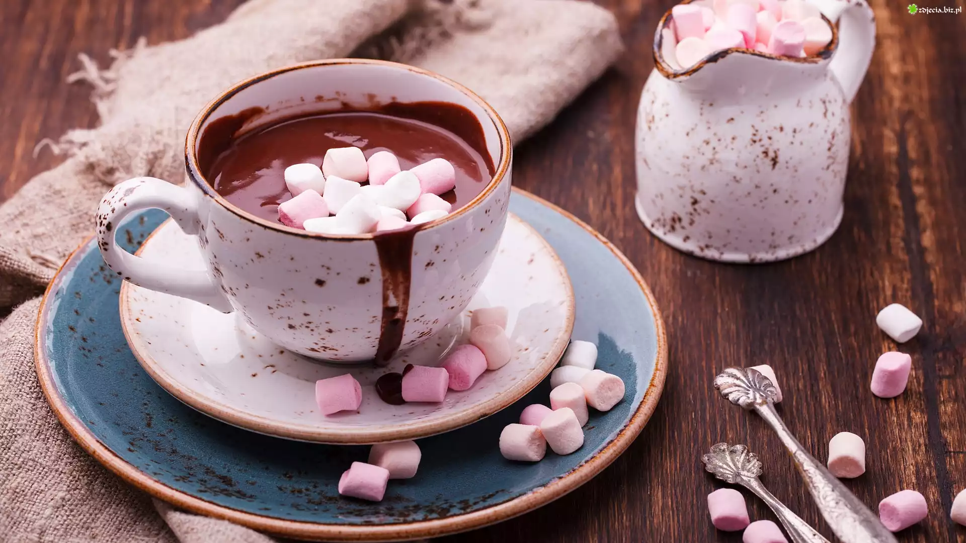 Zdjęcie Gorąca, Czekolada, Filiżanka, Spodek, Pianki, Dzbanuszek