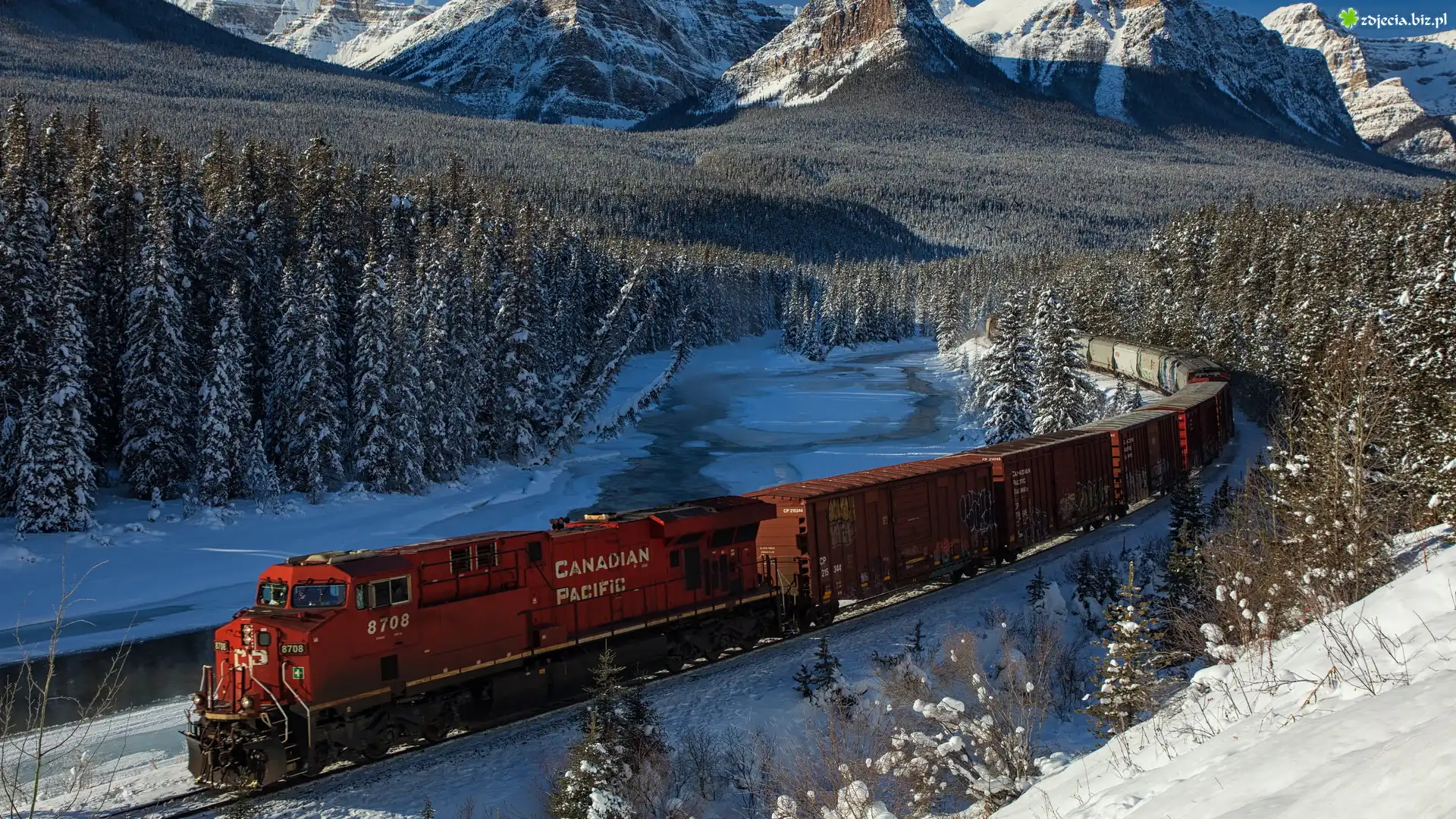 Zdjęcie Góry Skaliste, Zima, Las, Drzewa, Rzeka, Bow River, Park Narodowy Banff, Pociąg, Chmury, Alberta, Kanada |