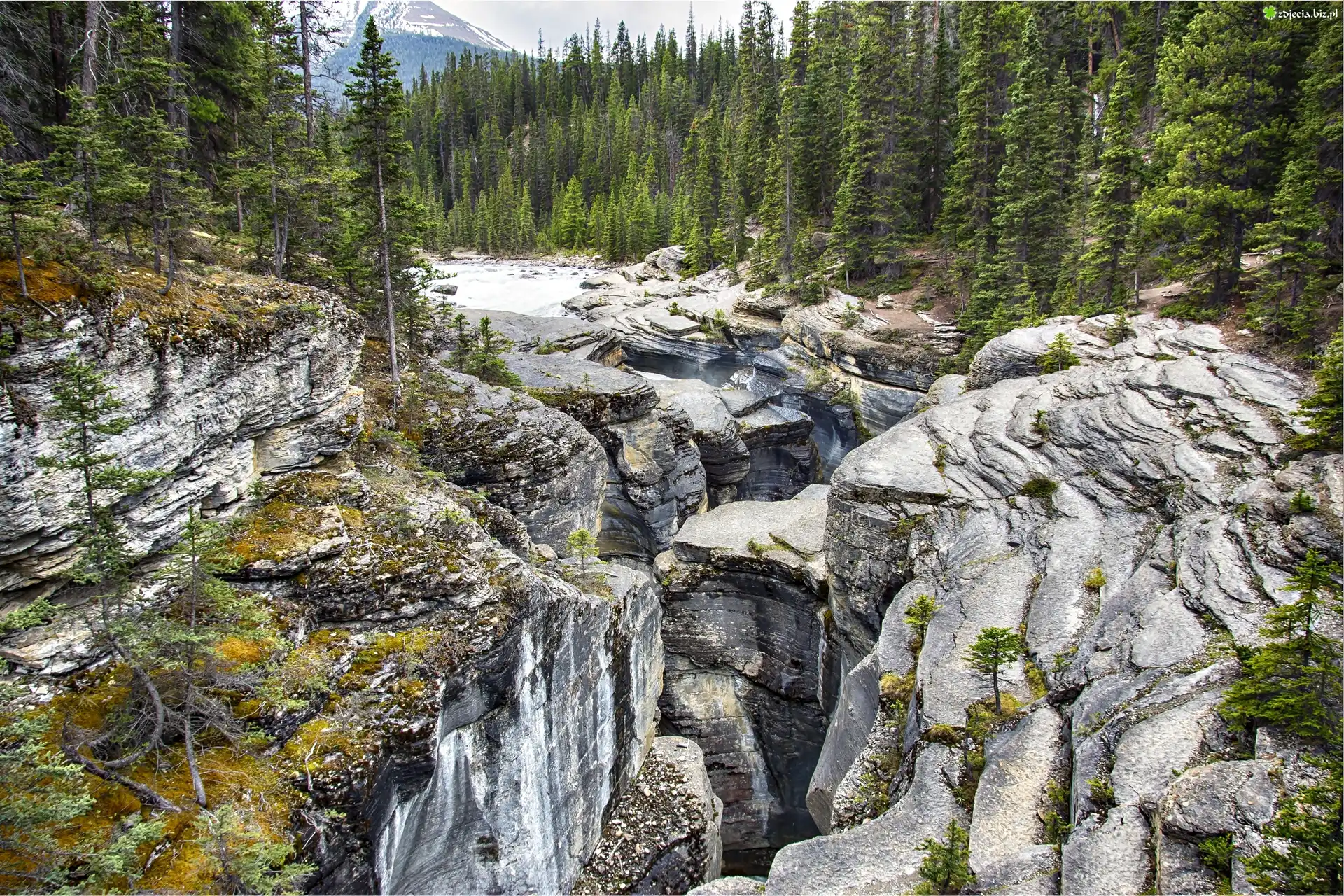 Zdjęcie, Kanada, Prowincja Alberta, Park Narodowy Banff, Góry, Las, Mistaya Canyon, Rzeka