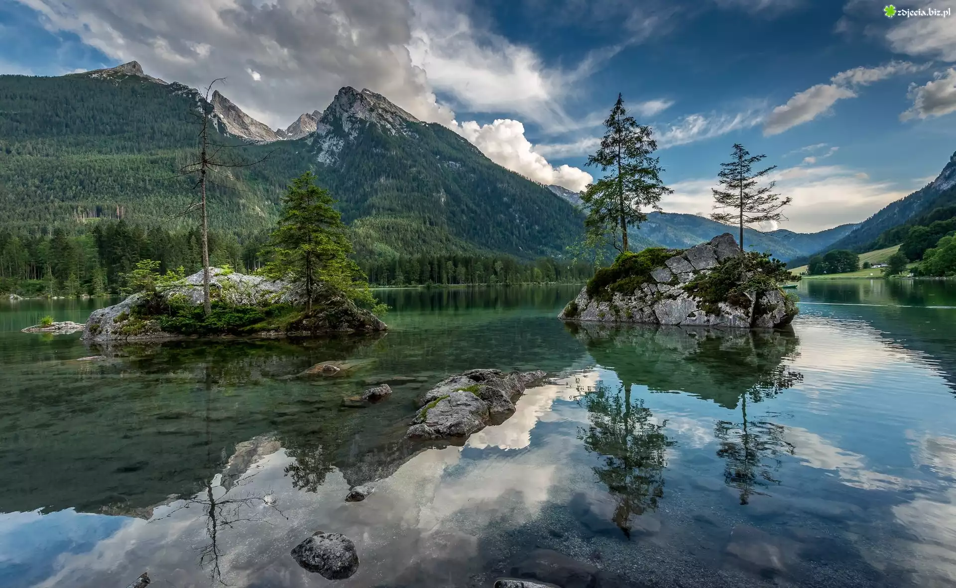 Zdjęcie Góry, Jezioro Hintersee, Skały, Drzewa, Chmury, Gmina Berchtesgaden, Bawaria, Niemcy