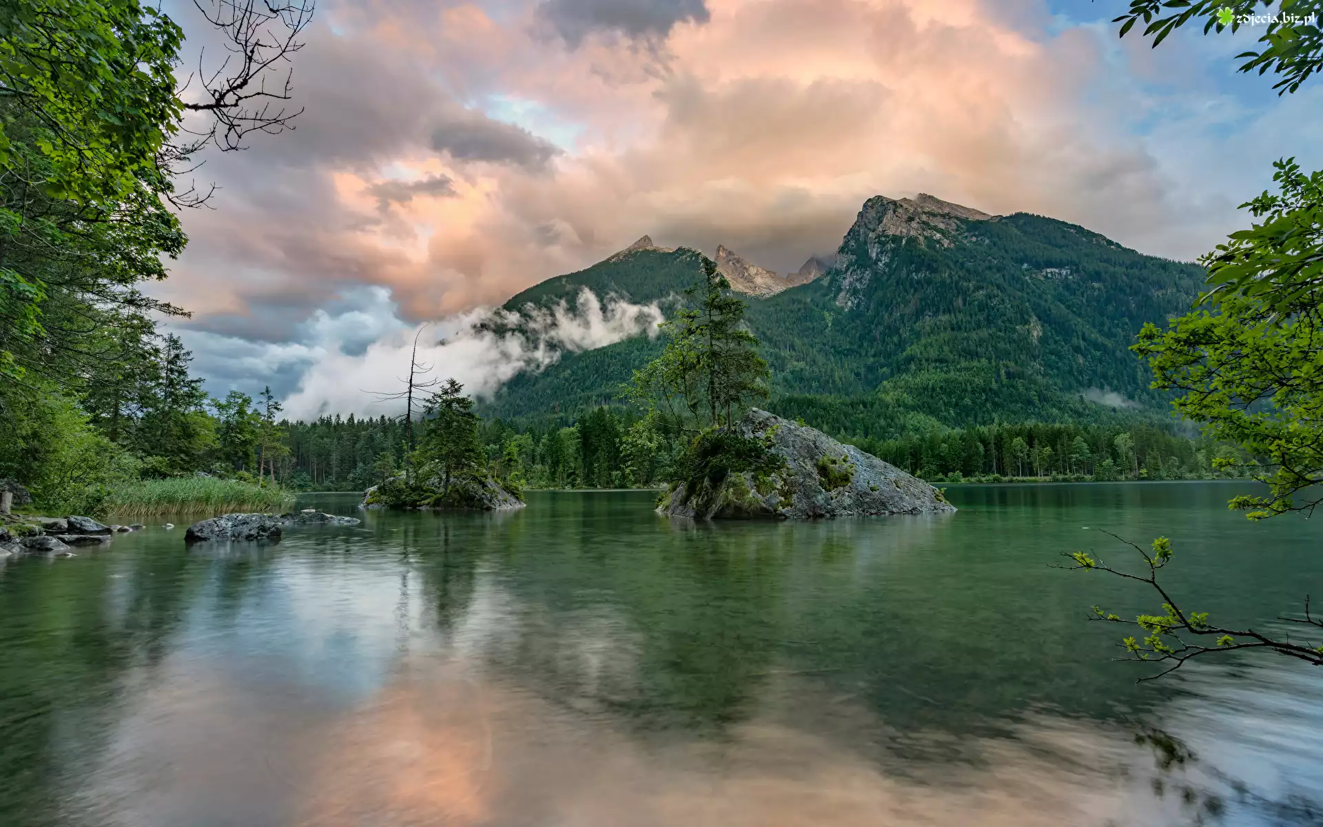 Zdjęcie Niemcy, Bawaria, Berchtesgaden, Jezioro Hintersee, Skały, Drzewa, Góry
