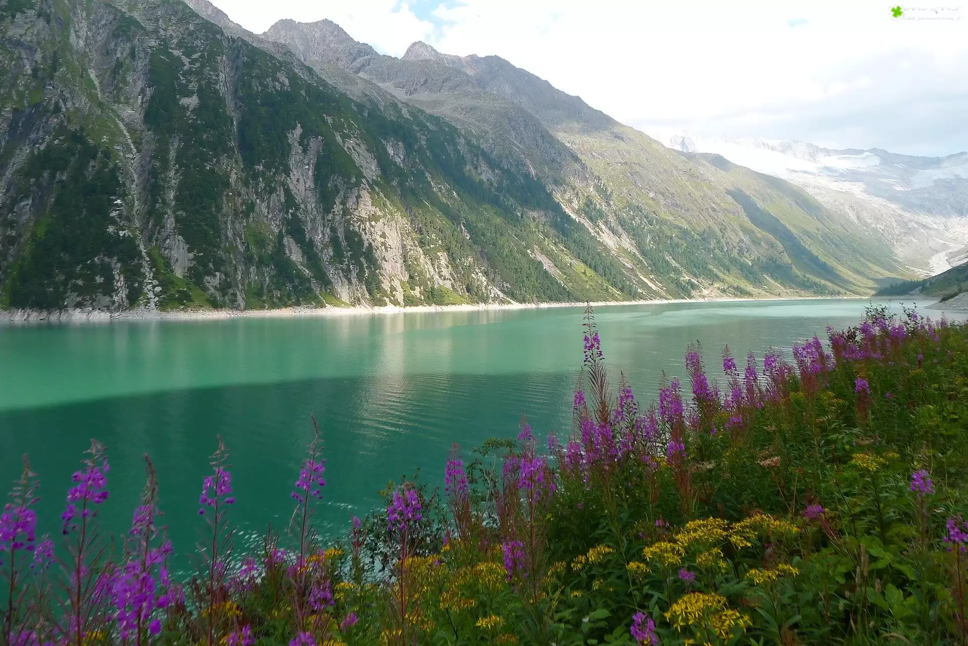Zdjęcie Góry, Jezioro, Brzeg, Kwiaty