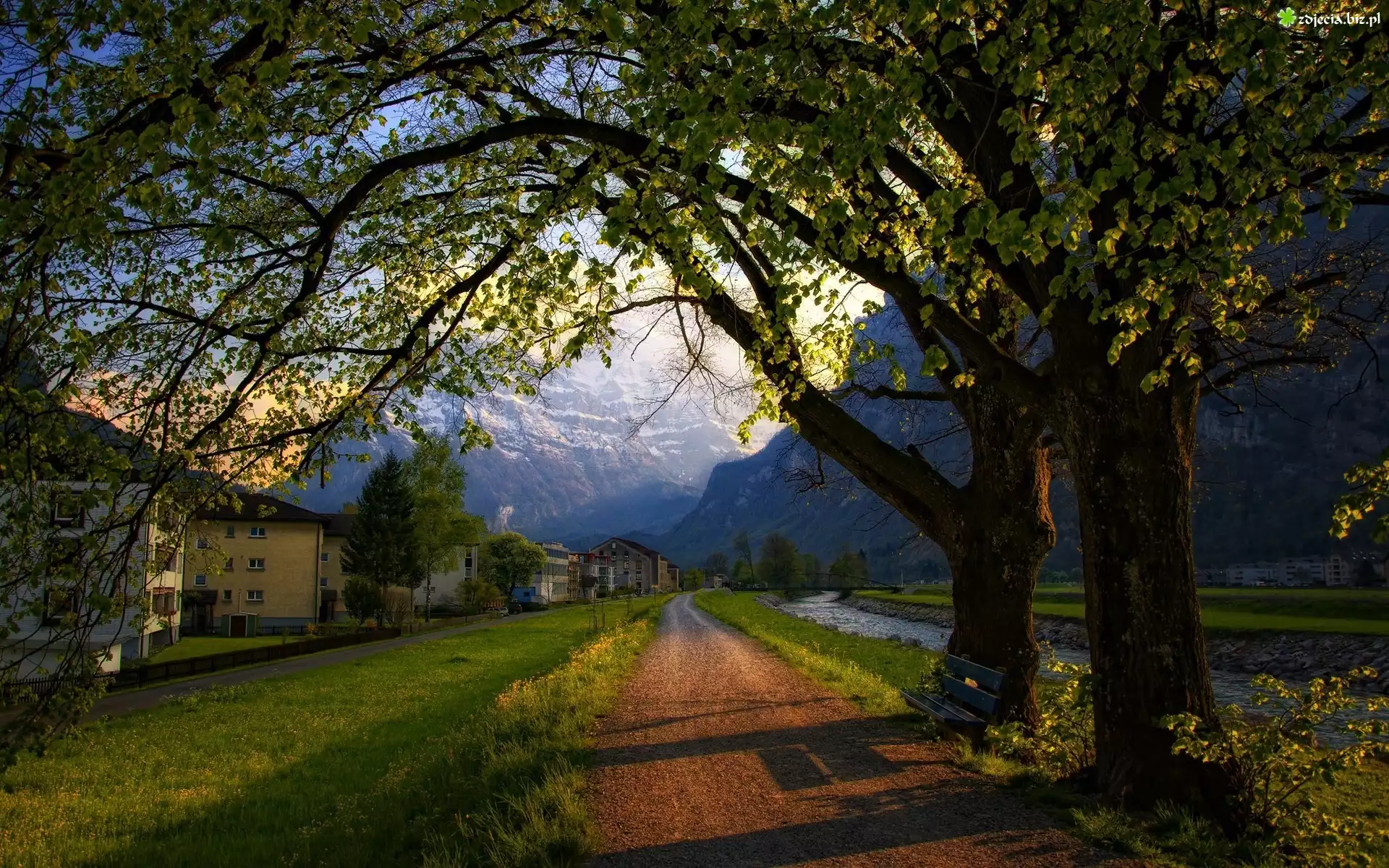 Zdjęcie Góry, Droga, Budynki, Drzewa