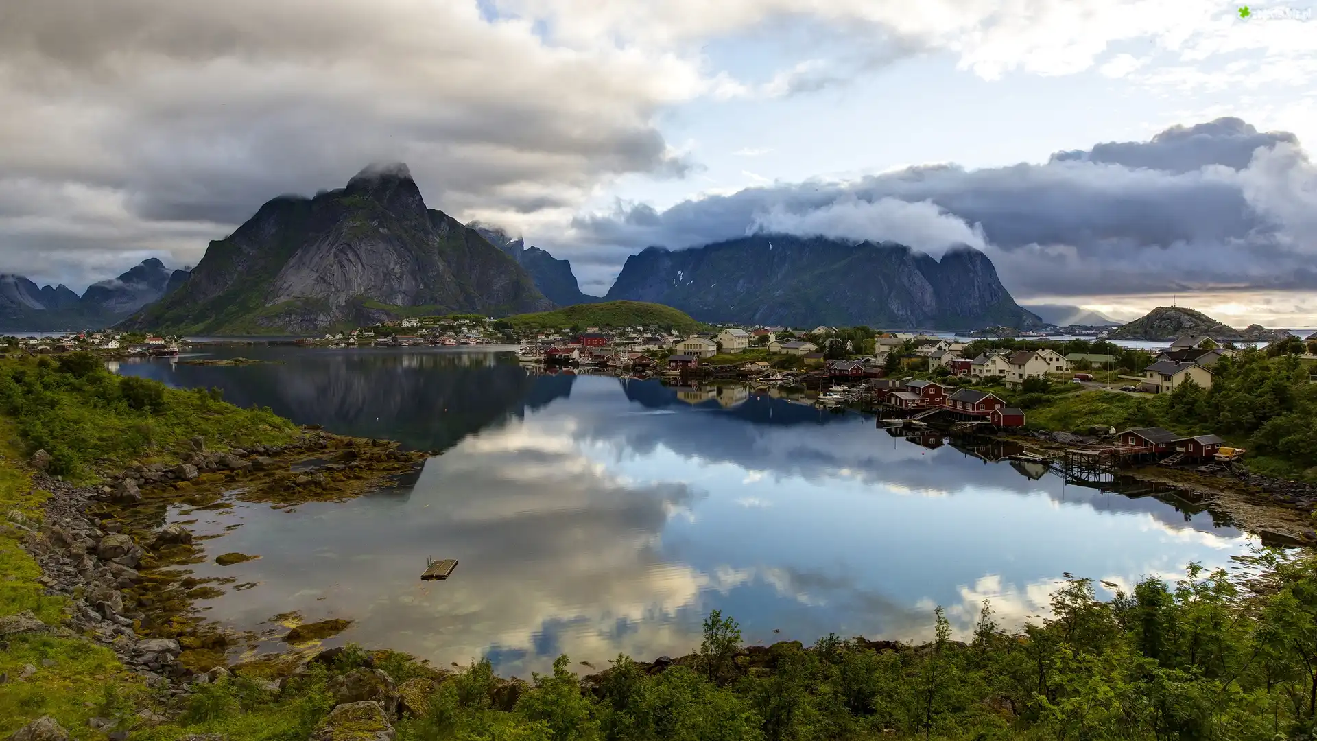 Zdjęcie Góry, Jezioro, Chmury, Domy