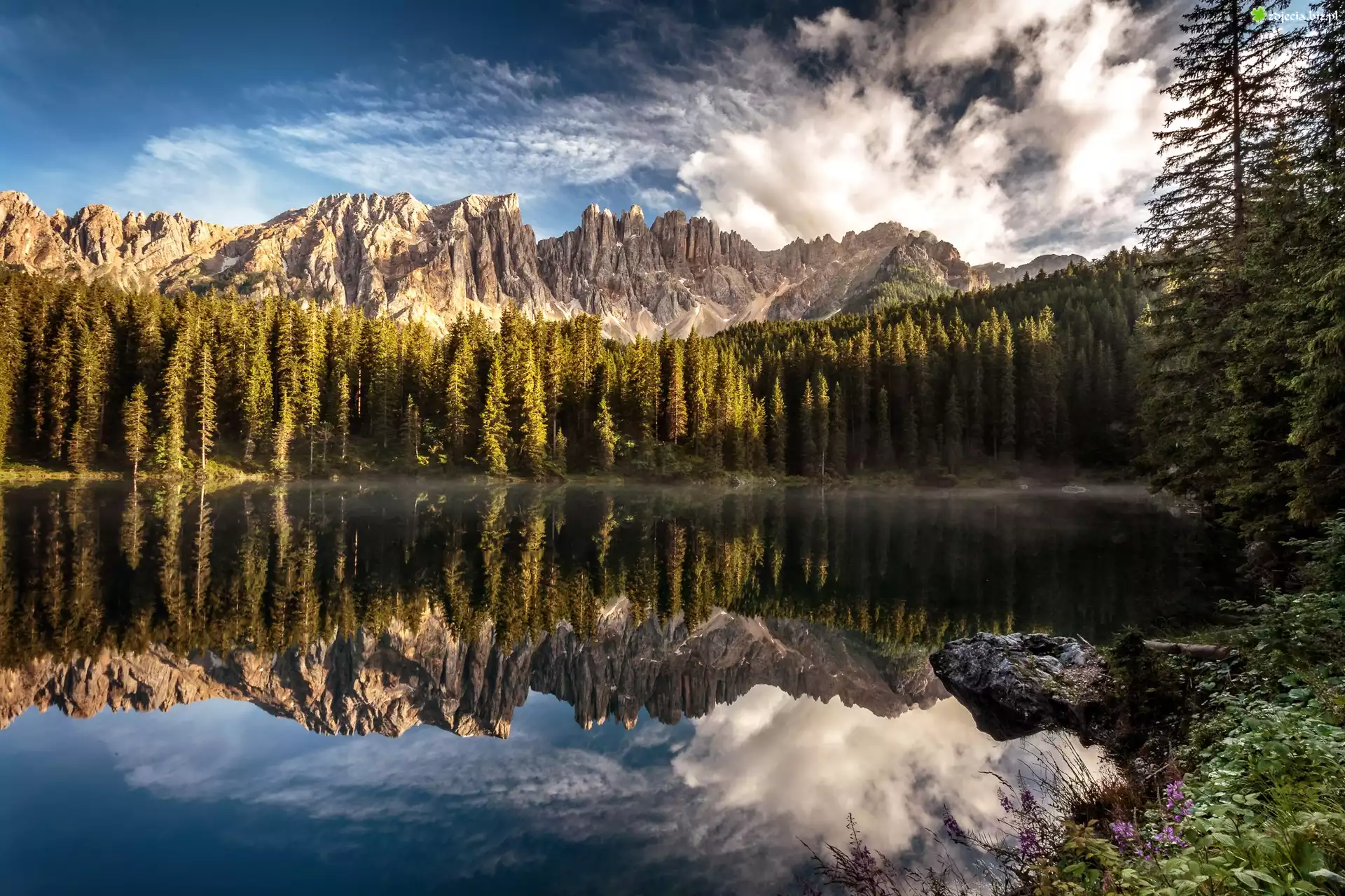 Zdjęcie Góry, Las, Jezioro, Chmury, Odbicie