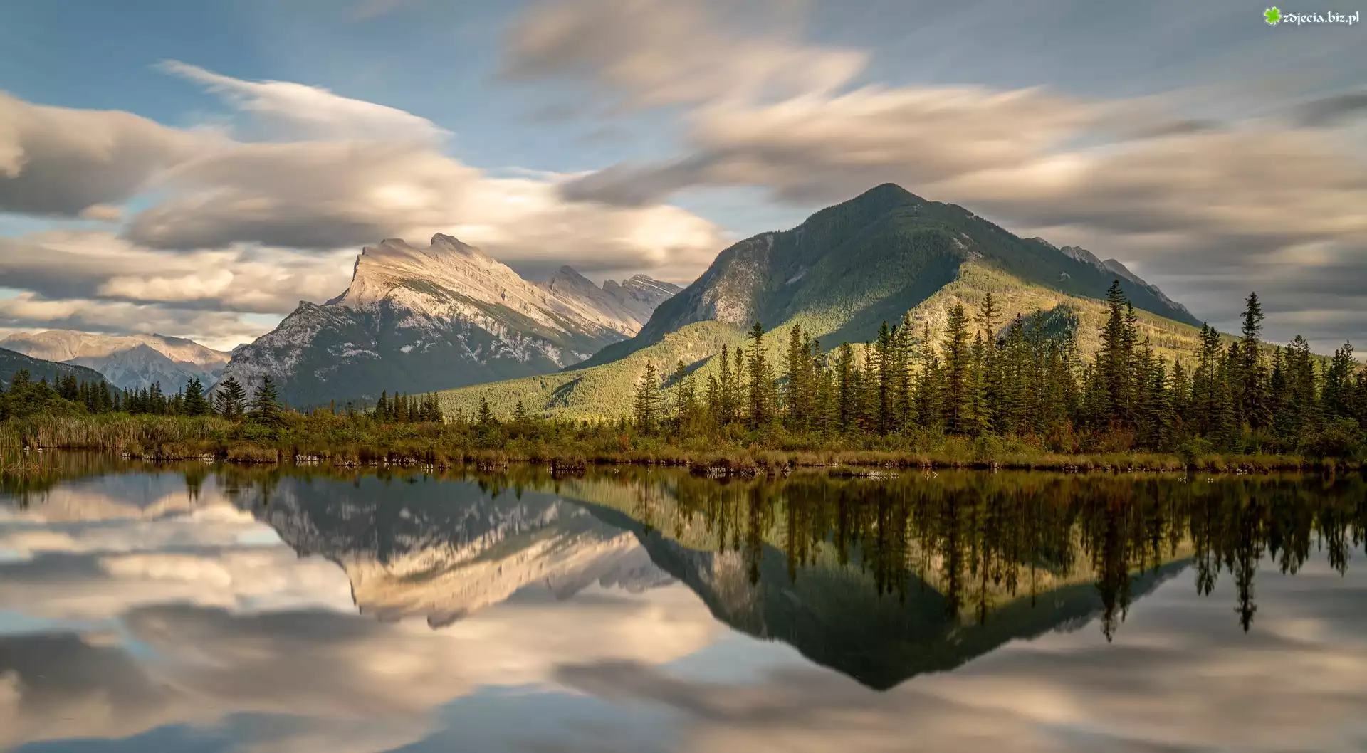 Zdjęcie Góry, Jezioro, Las, Drzewa, Chmury, Odbicie