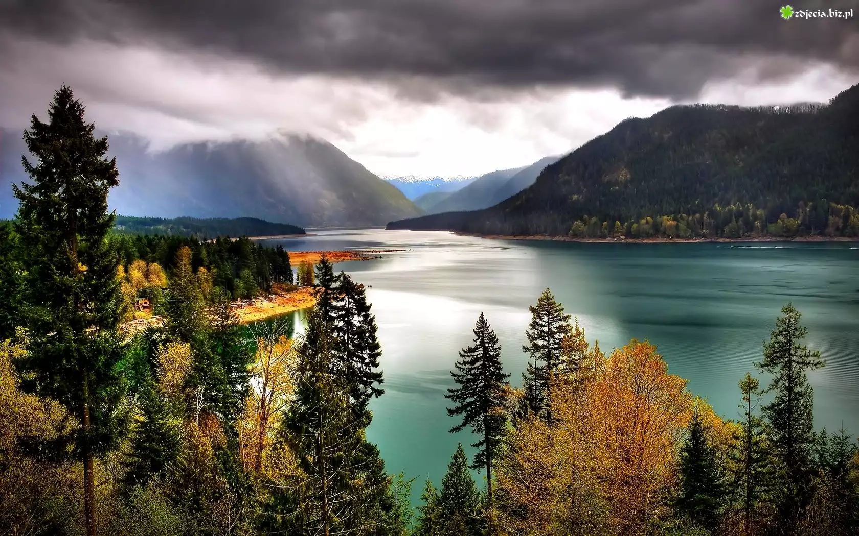 Zdjęcie Góry, Woda, Drzewa, Ciemne, Chmury
