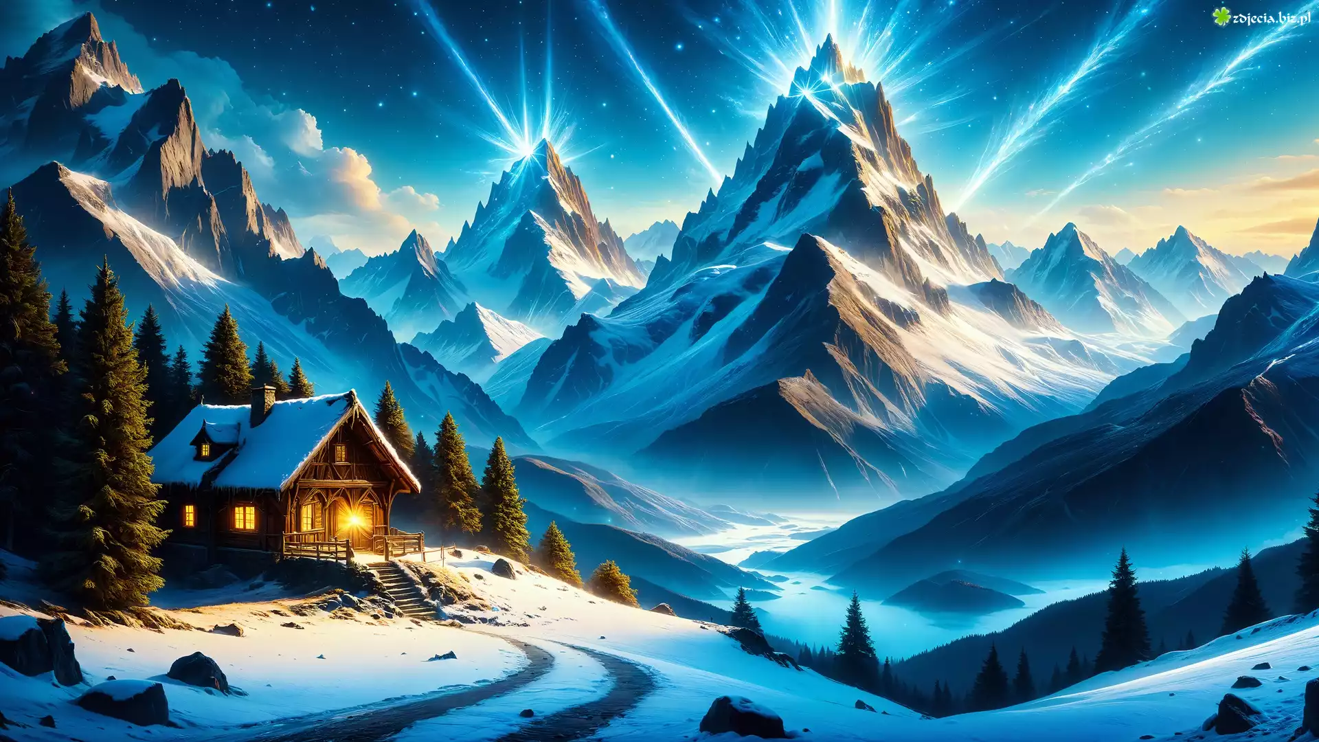 Zdjęcie Zima, Góry, Dom, Drzewa, Grafika