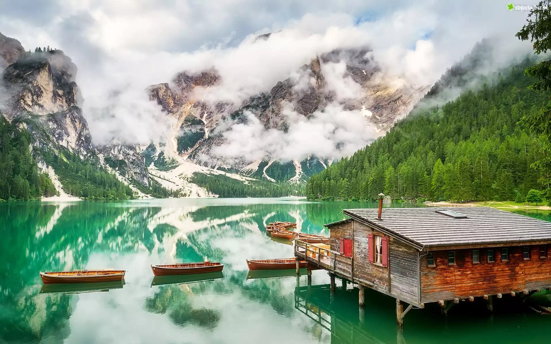 Zdjęcie Góry, Dolomity, Jezioro, Pragser Wildsee, Łódki, Lasy, Mgła, Dom, Drewniany