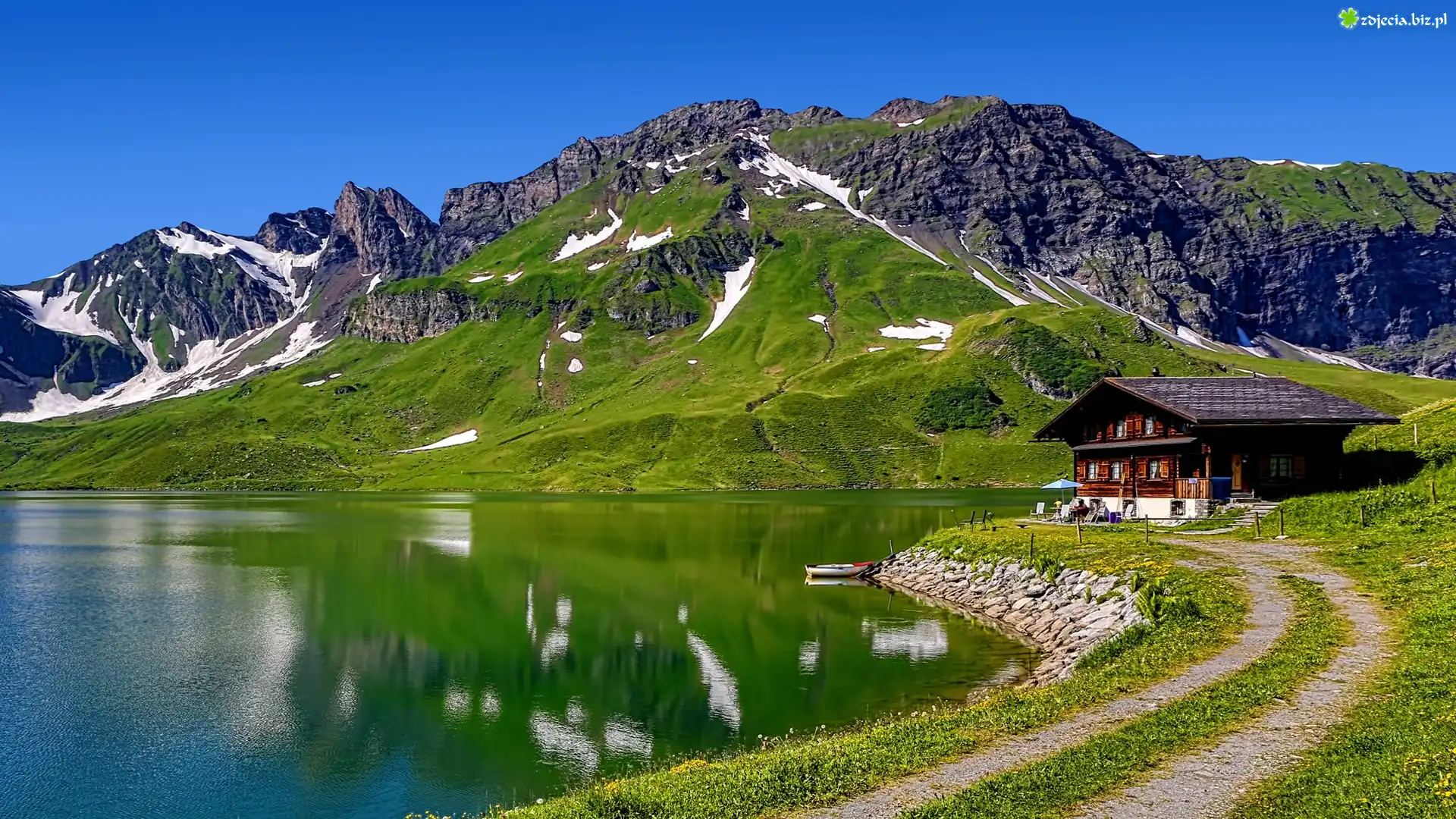 Zdjęcie Góry, Jezioro, Łódka, Dom, Droga