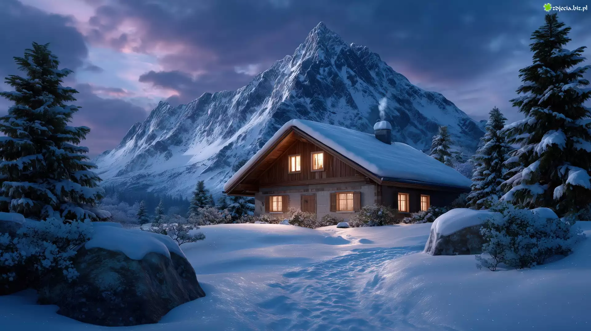 Zdjęcie Zima, Oświetlony, Dom, Góry, Wieczór, Grafika AI