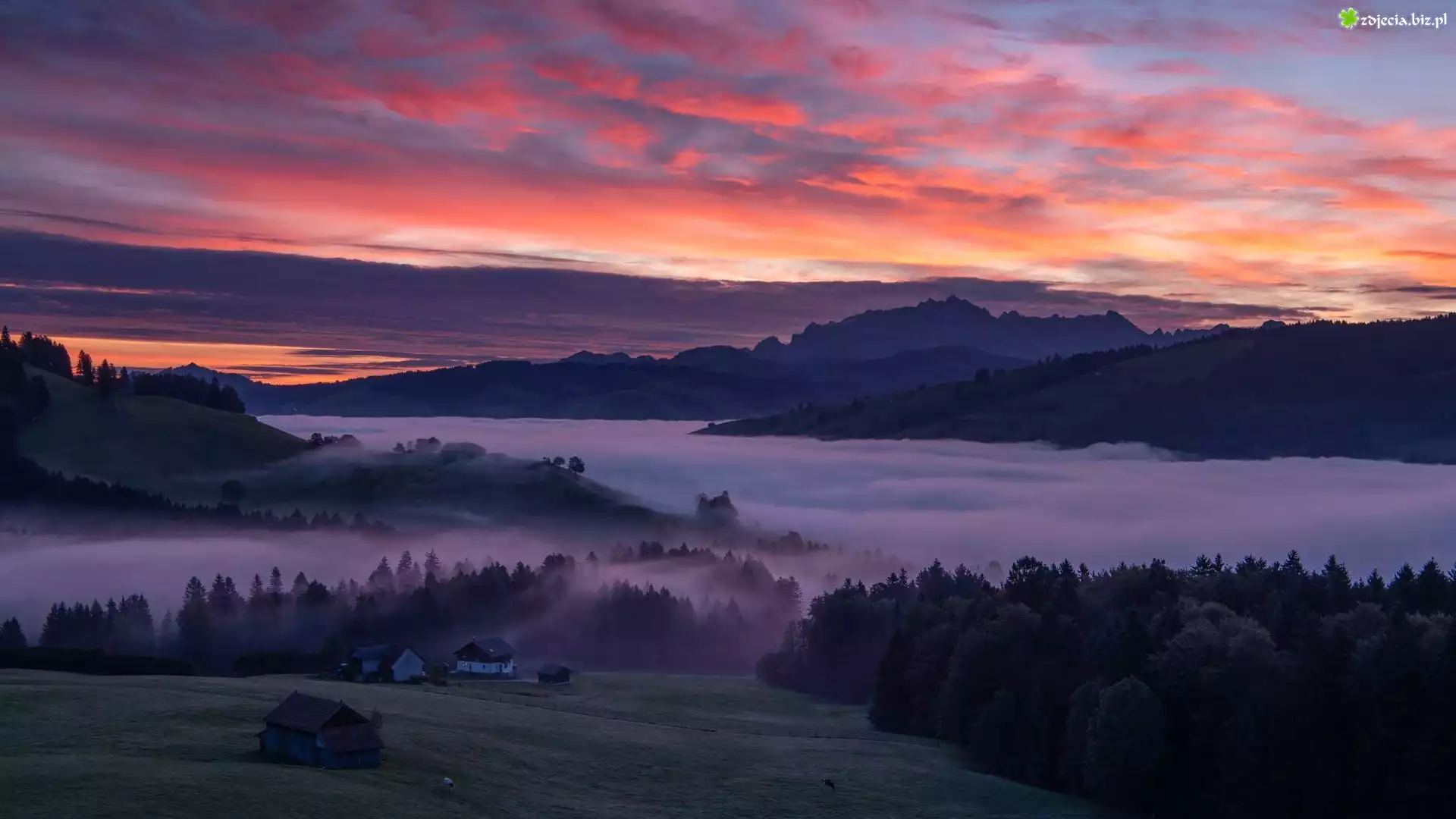Zdjęcie Góry, Kolorowe, Niebo, Opadająca, Mgła, Drzewa, Domy, Wschód słońca