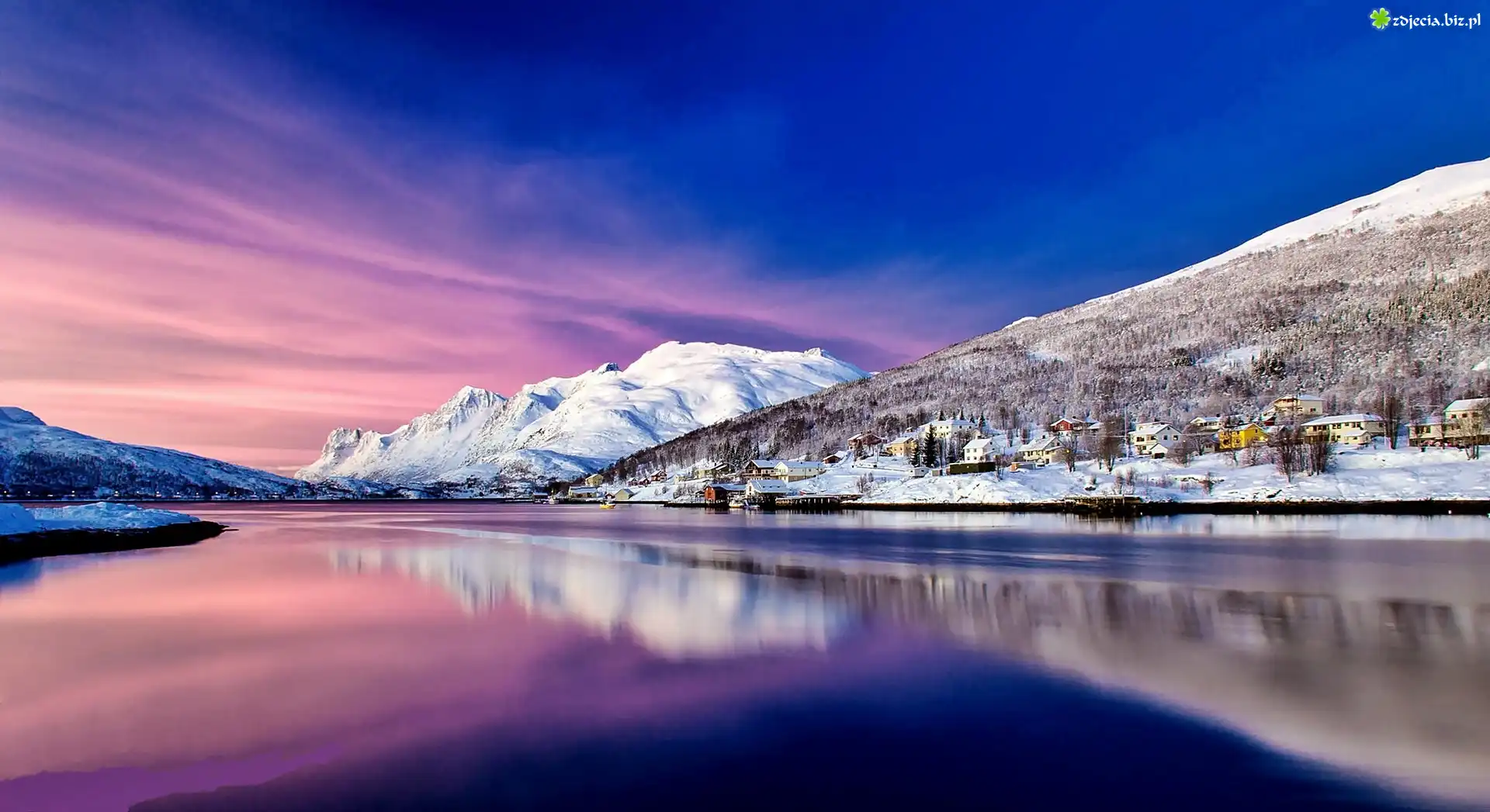 Zdjęcie Góry, Morze, Domy, Świt