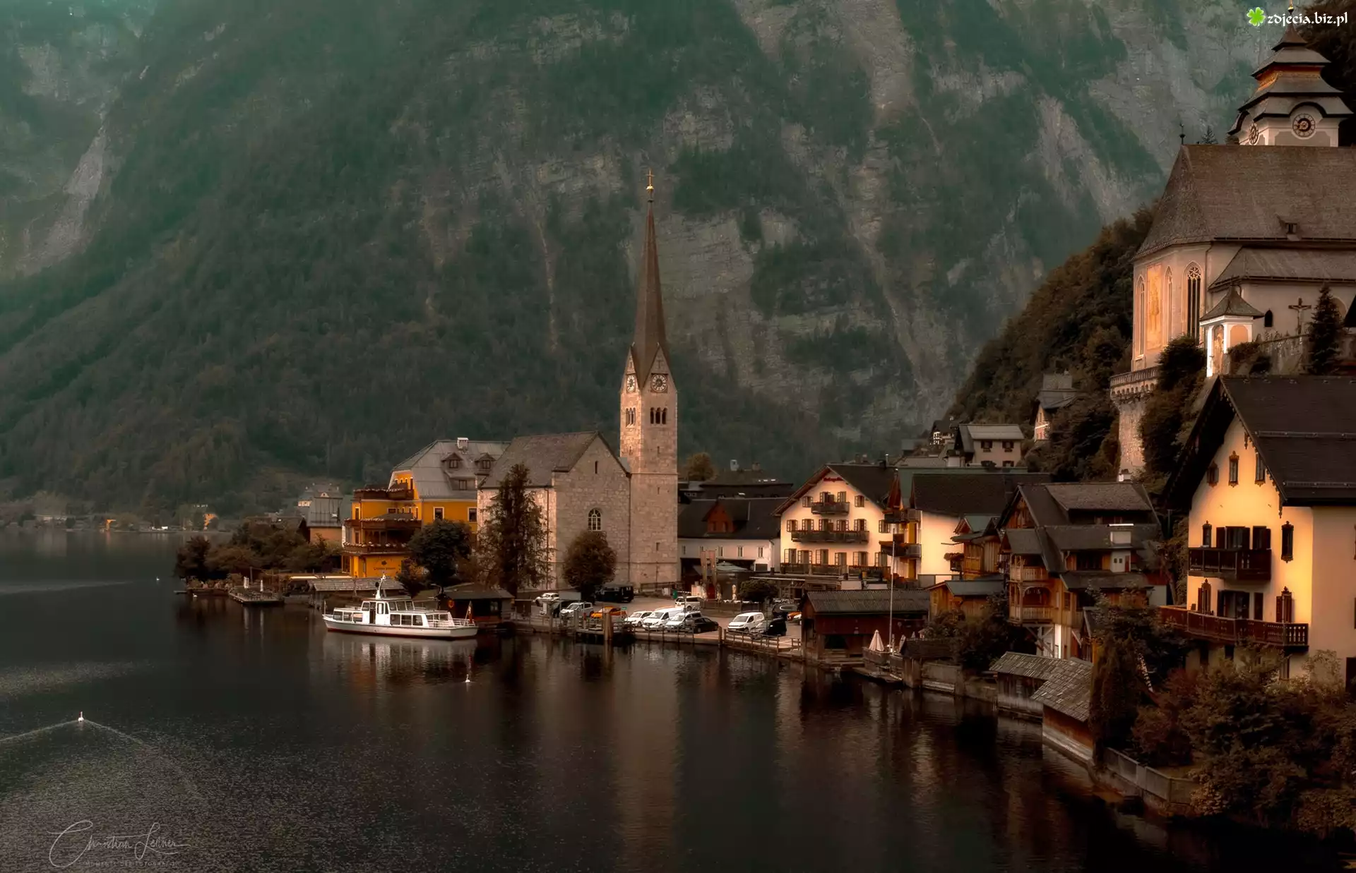 Zdjęcie Góry, Alpy Salzburskie, Jezioro Hallstattersee, Hallstatt, Domy, Kościół, Austria